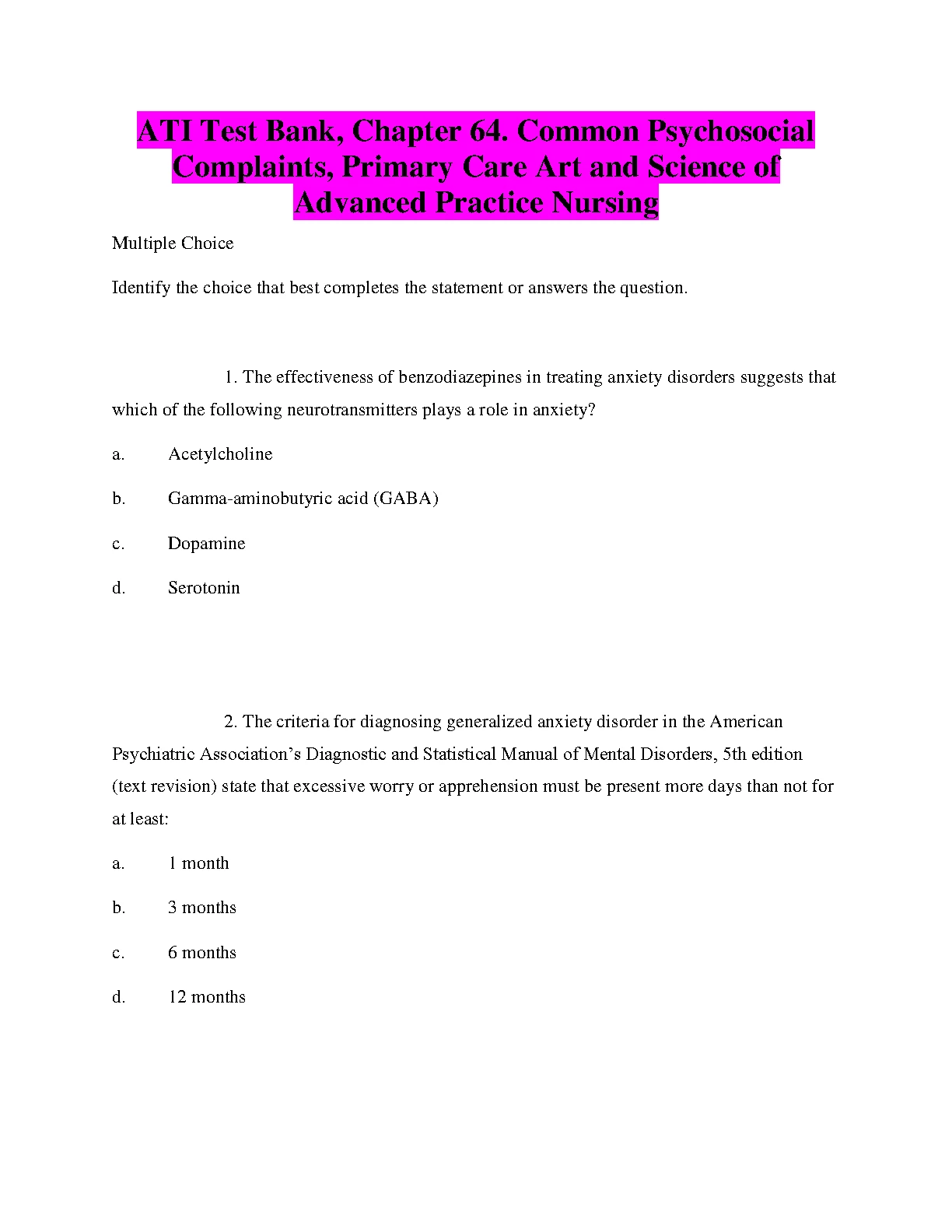 TEST BANK FOR ATI, Chapter 64. Common Psychosocial Complaints, Primary Care Art and Science of Advanced Practice Nursing