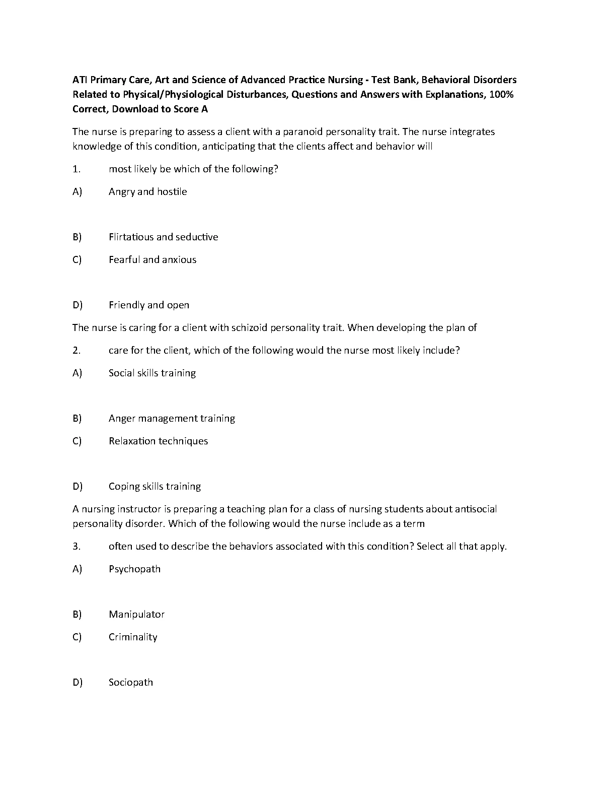 TEST BANK FOR ATI Primary Care, Art and Science of Advanced Practice Nursing, Behavioral Disorders Related to Physical/Physiological Disturbances, Questions and Answers with Explanations. DOWNLOAD on www.hackedexams.com INSTANTLY.