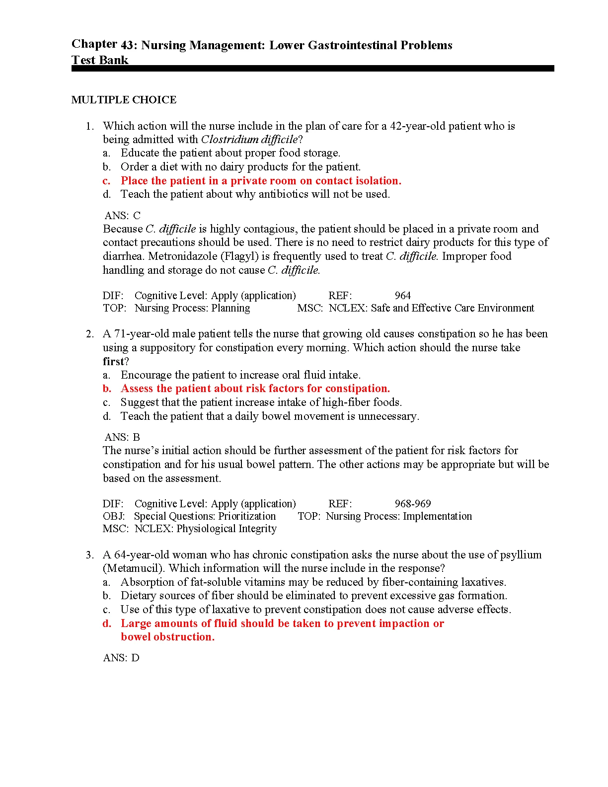 TEST BANK FOR NURSING (Chapter 43: Nursing Management: Lower Gastrointestinal Problems)