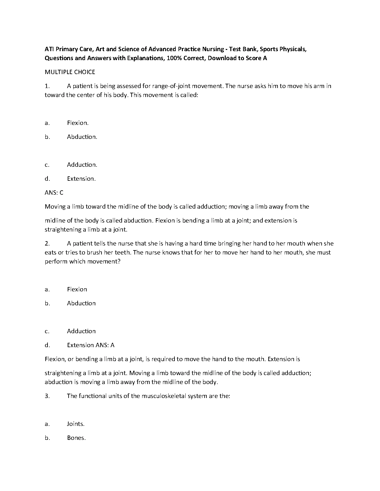 TEST BANK FOR ATI Primary Care, Art and Science of Advanced Practice Nursing, Sports Physicals, Questions and Answers with Explanations