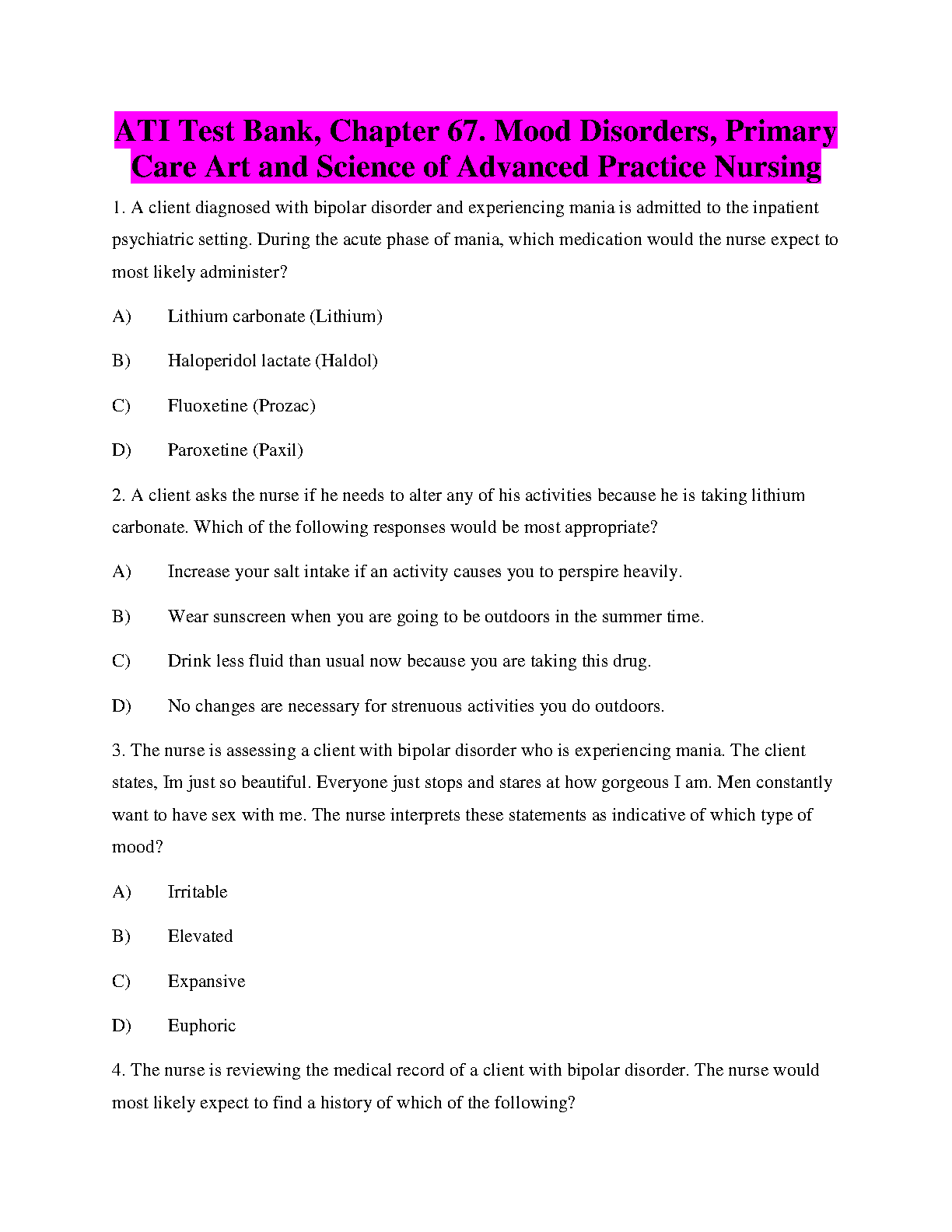 TEST BANK FOR ATI, Chapter 67. Mood Disorders, Primary Care Art and Science of Advanced Practice Nursing