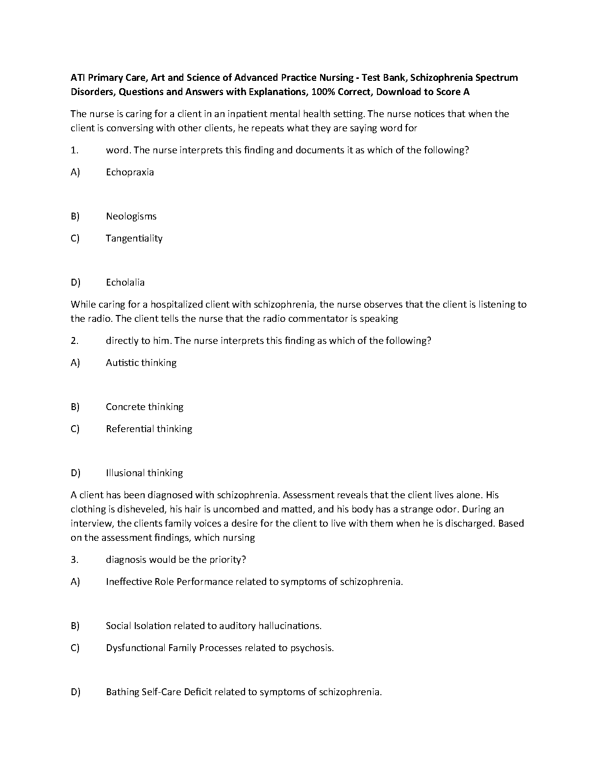 TEST BANK FOR ATI Primary Care, Art and Science of Advanced Practice Nursing, Schizophrenia Spectrum Disorders, Questions and Answers with Explanations