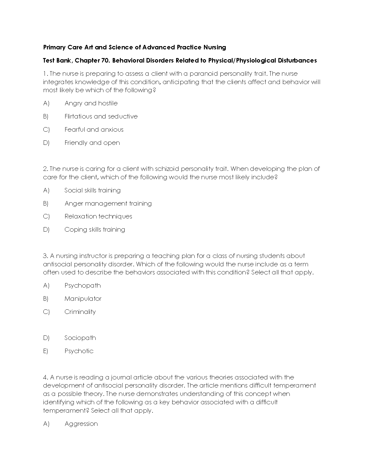 Test Bank For Primary Care Art and Science of Advanced Practice Nursing, Chapter 70. Behavioral Disorders Related to Physical/Physiological Disturbances