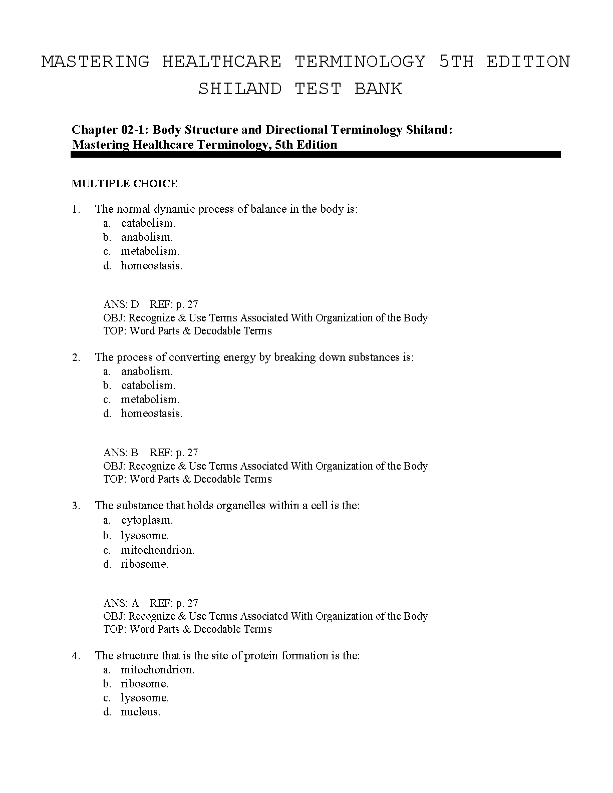 TEST BANK FOR MASTERING HEALTH CARE TERMINOLOGY 5TH EDITION BY SHILAND