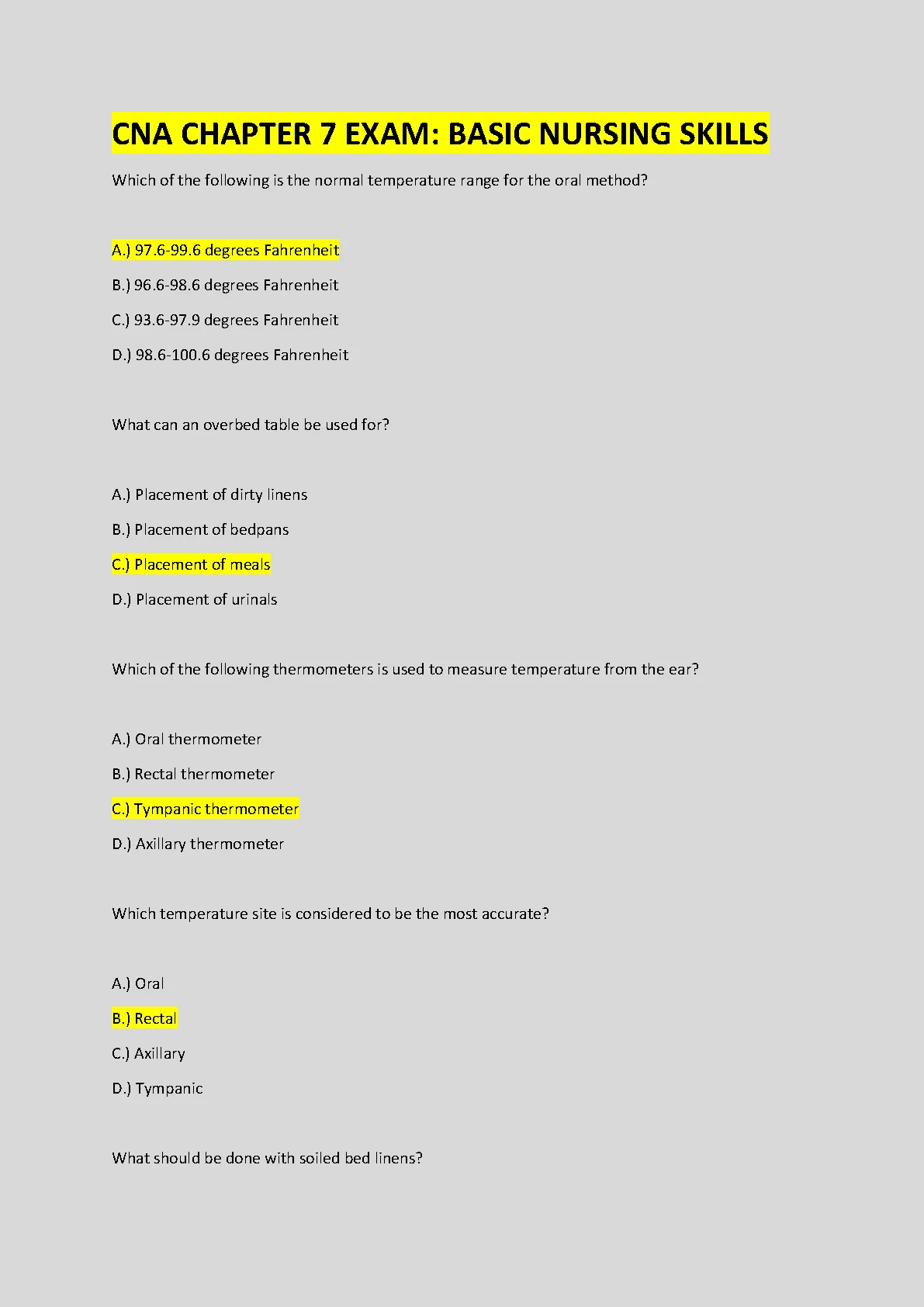 CNA CHAPTER 7 EXAM: BASIC NURSING SKILLS 2023/2024