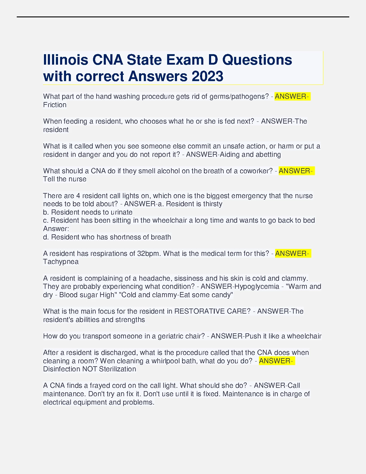 Illinois CNA State Exam D Questions with correct Answers 2023/2024. DOWNLOAD on www.hackedexams.com INSTANTLY.