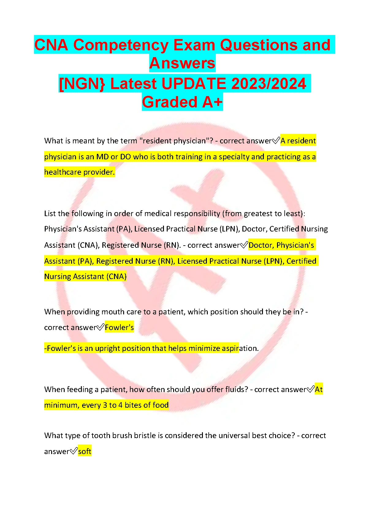 CNA Competency Exam Questions and Answers[NGN} LATEST UPDATED VERSION 2023/2024. DOWNLOAD on www.hackedexams.com INSTANTLY.