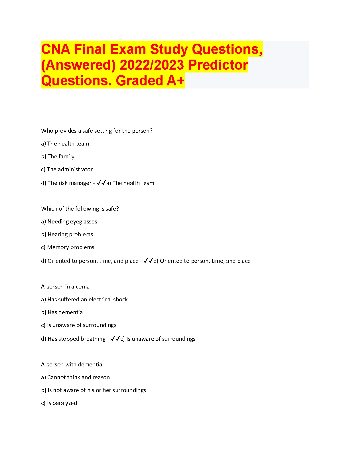 CNA Final Exam Study Predictor. QUESIONS AND ANSWERS 2022/2023. DOWNLOAD on www.hackedexams.com INSTANTLY.
