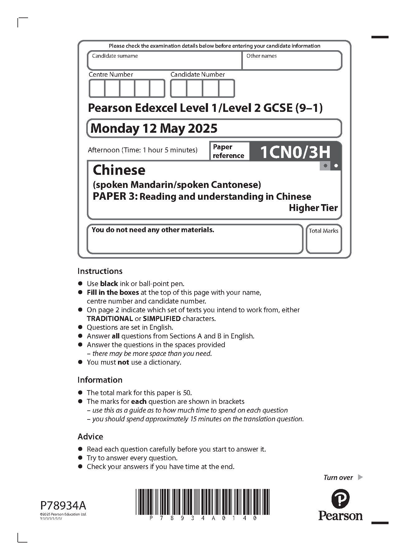 PEARSON EDEXCEL GCSE CHINESE HIGHER TIER PAPER 3 2025