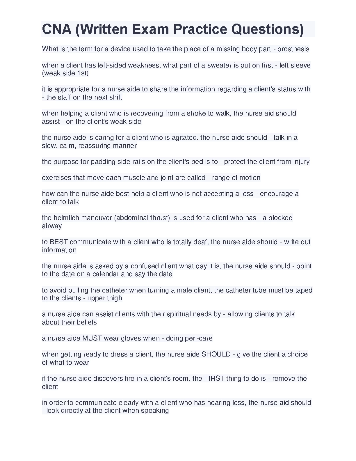 CNA (Written Exam Practice Questions). MOST RELIABLE FOR BEST SCORES 2023