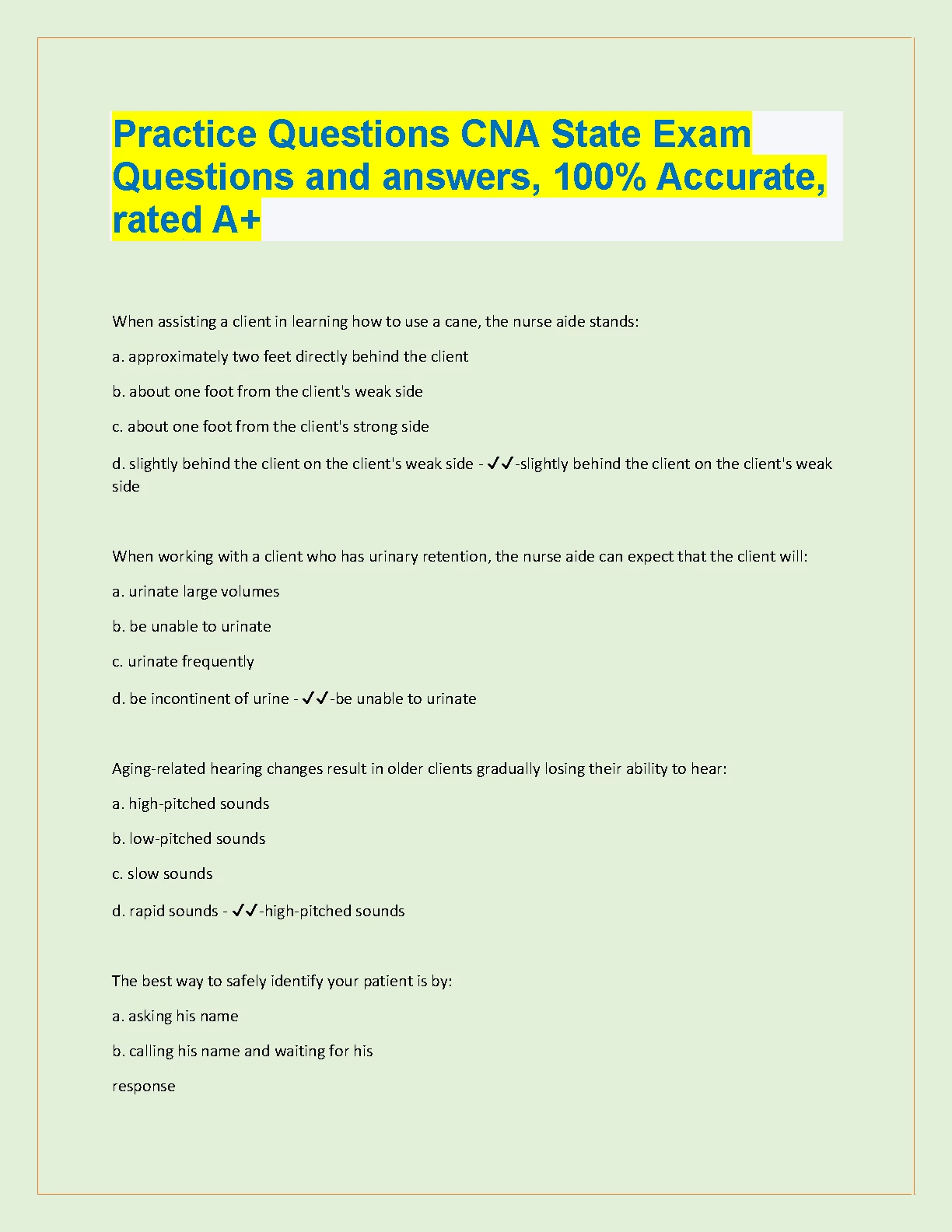 Practice Questions CNA State Exam Questions and Answers 2023