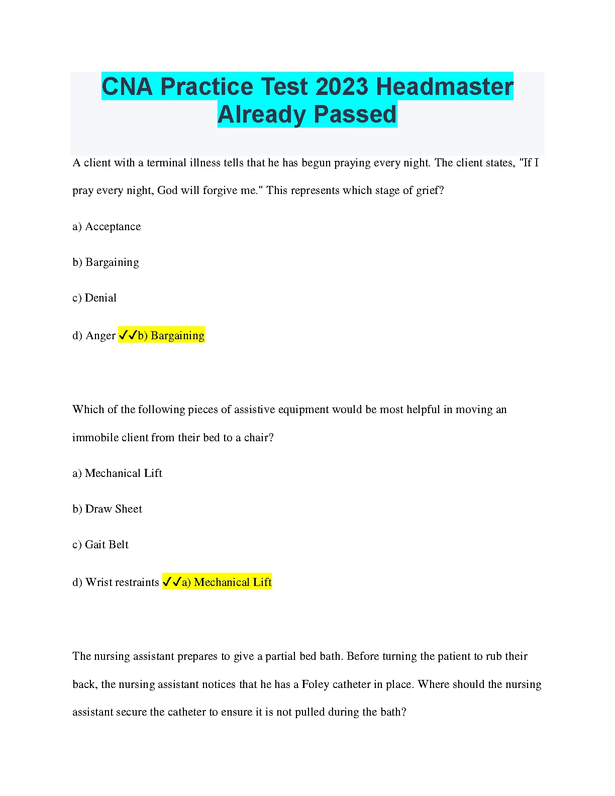 CNA Practice Test Headmaster. MOST RECENT WITH COMPLETE SOLUTIONS 2023