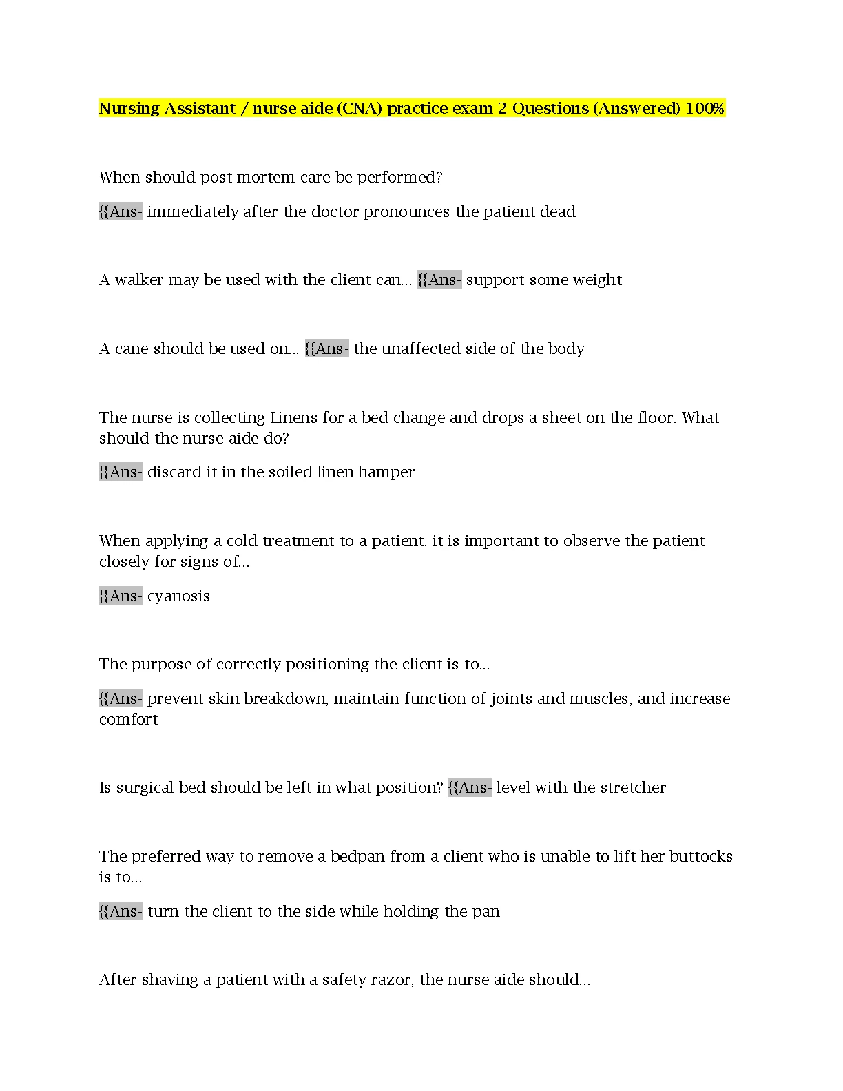 Nursing Assistant / Nurse Aide (CNA) Practice Exam 2. MOST RECENT WITH 100% SCORES. DOWNLOAD on www.hackedexams.com INSTANTLY.