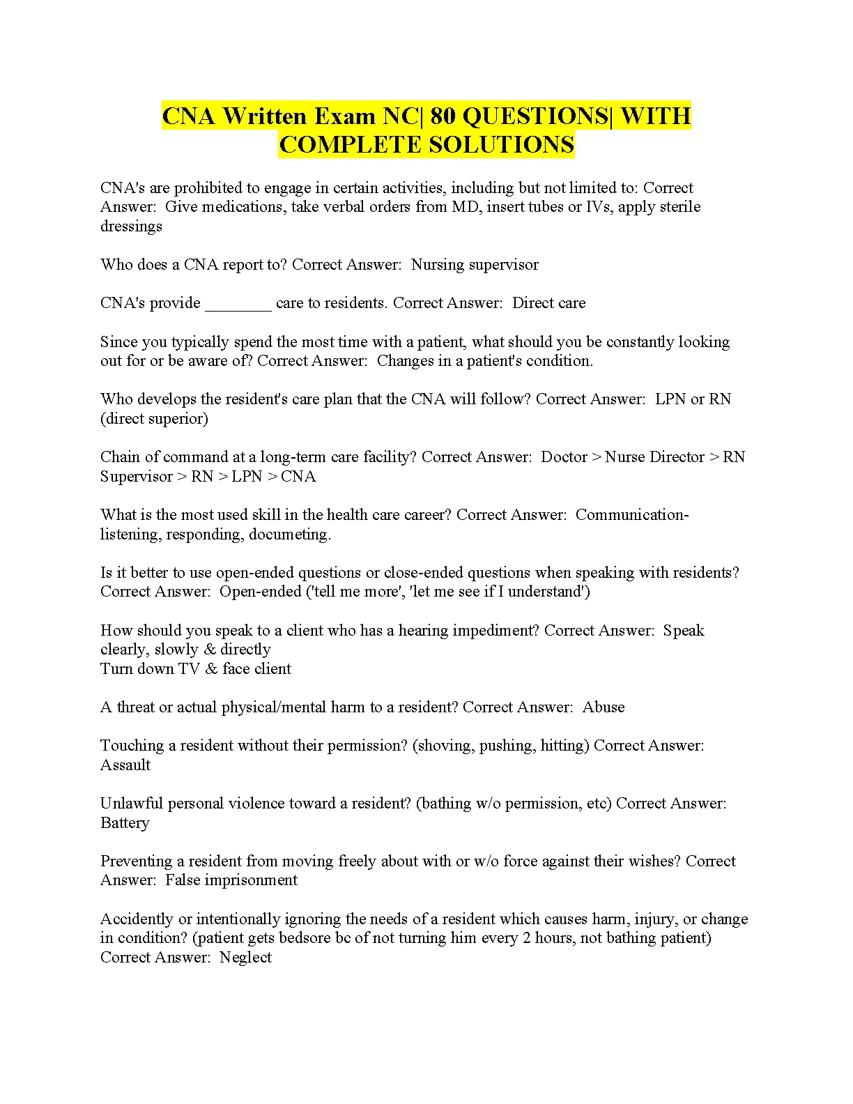 CNA Written Exam. QUESTIONS| WITH COMPLETE SOLUTIONS 2023. DOWNLOAD on www.hackedexams.com INSTANTLY.