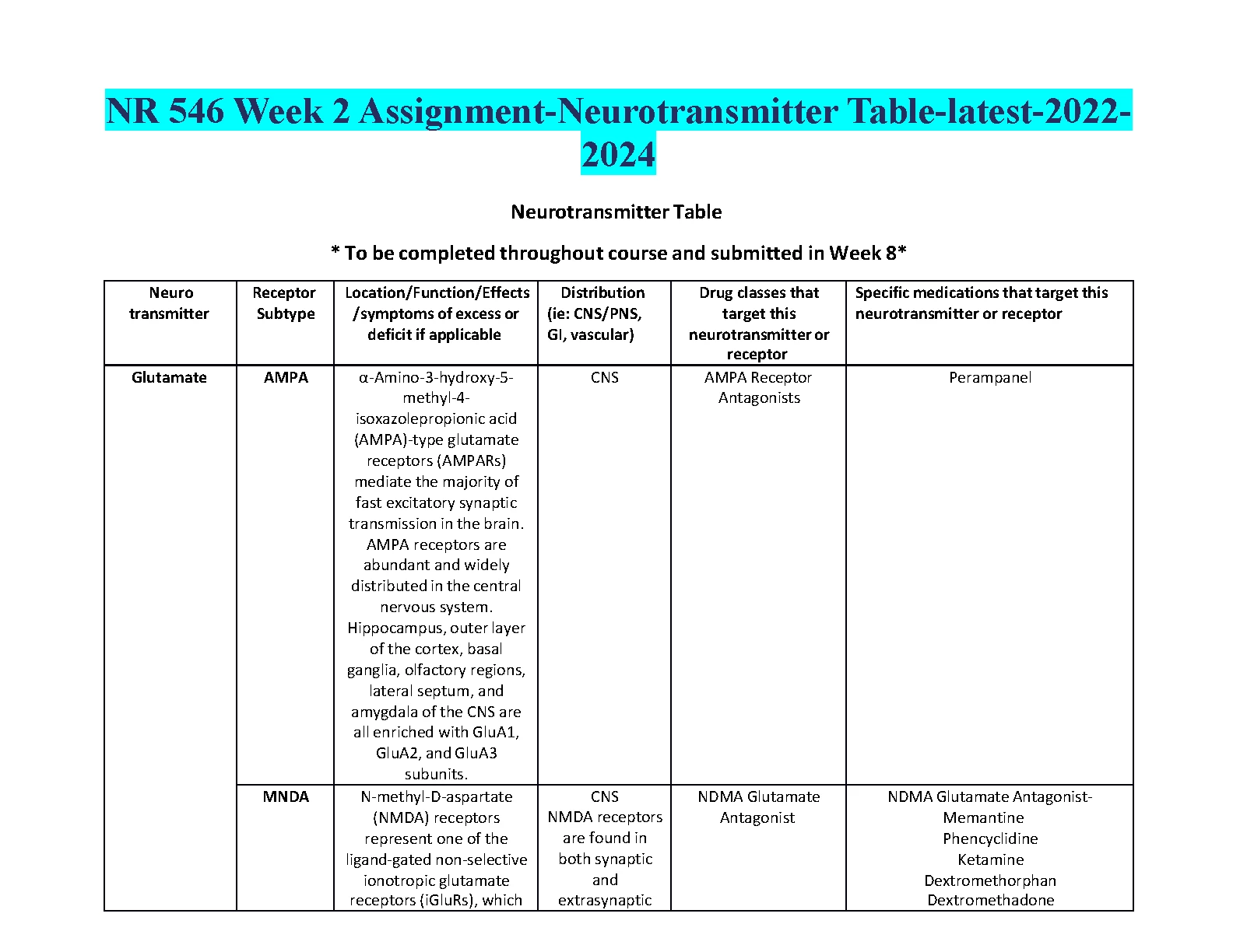 NR 546 Week 2 Assignment-Neurotransmitter Table. LATEST UPADTED VERSION 2023/2024. DOWNLOAD on www.hackedexams.com INSTANTLY.