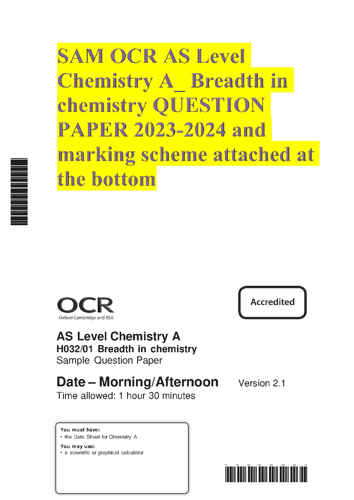 OCR AS Level Chemistry A H032/01 Breadth in chemistry Sample Question Paper 2023/2024. DOWNLOAD on www.hackedexams.com INSTANTLY.