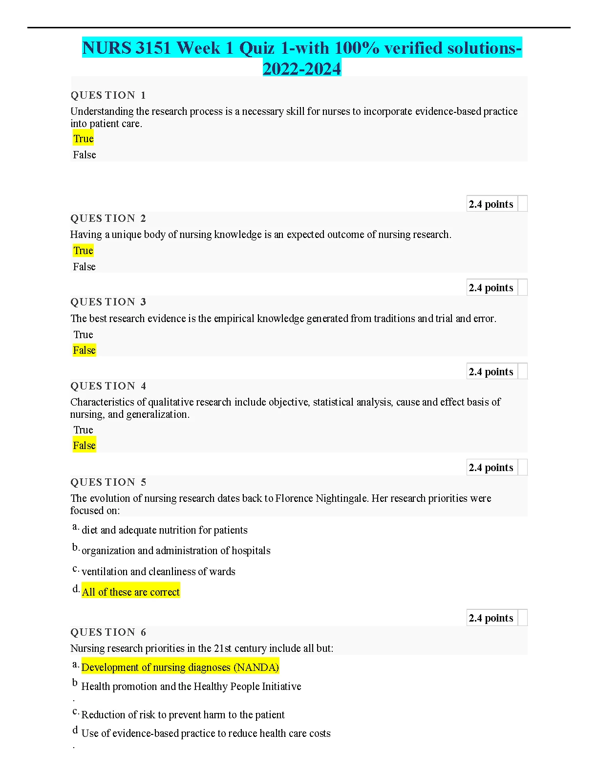 NURS 3151 Week 1 Quiz 1 With 100% Verified Solutions 2023/2024