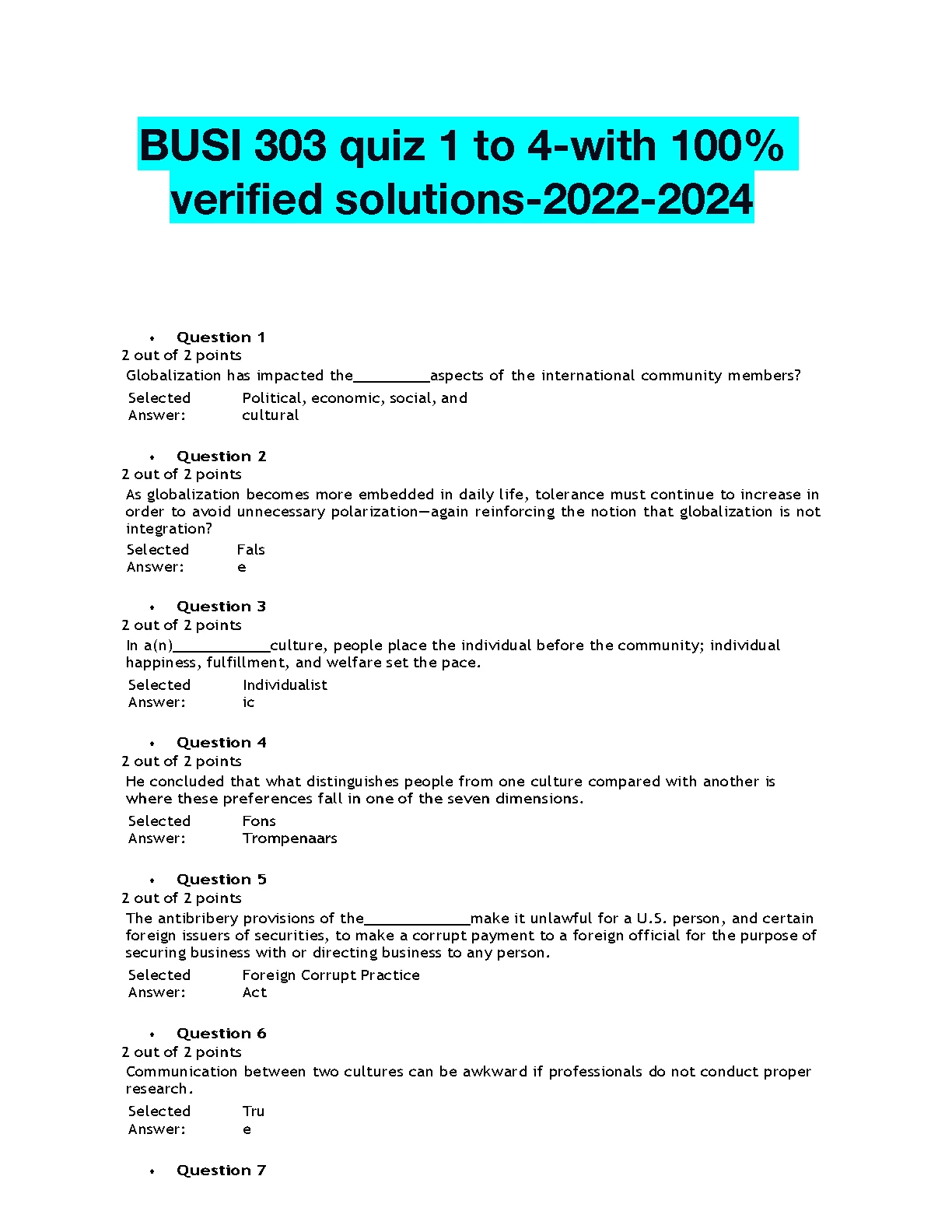 BUSI 303 quiz 1 to 4 . With 100% Verified Solutions 2023/2024