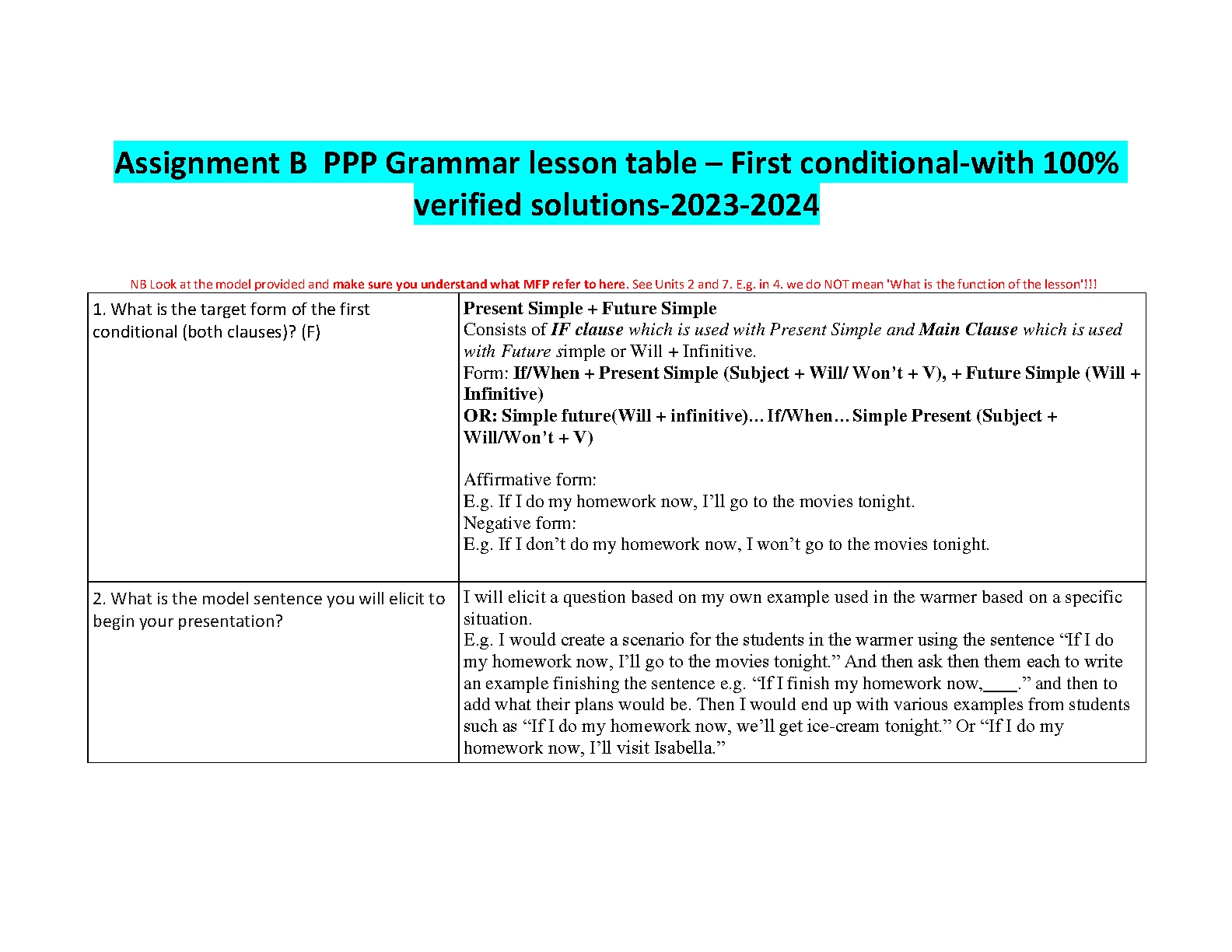 Assignment B PPP Grammar Lesson Table. First conditional with 100% Verified Solutions 2023/2024