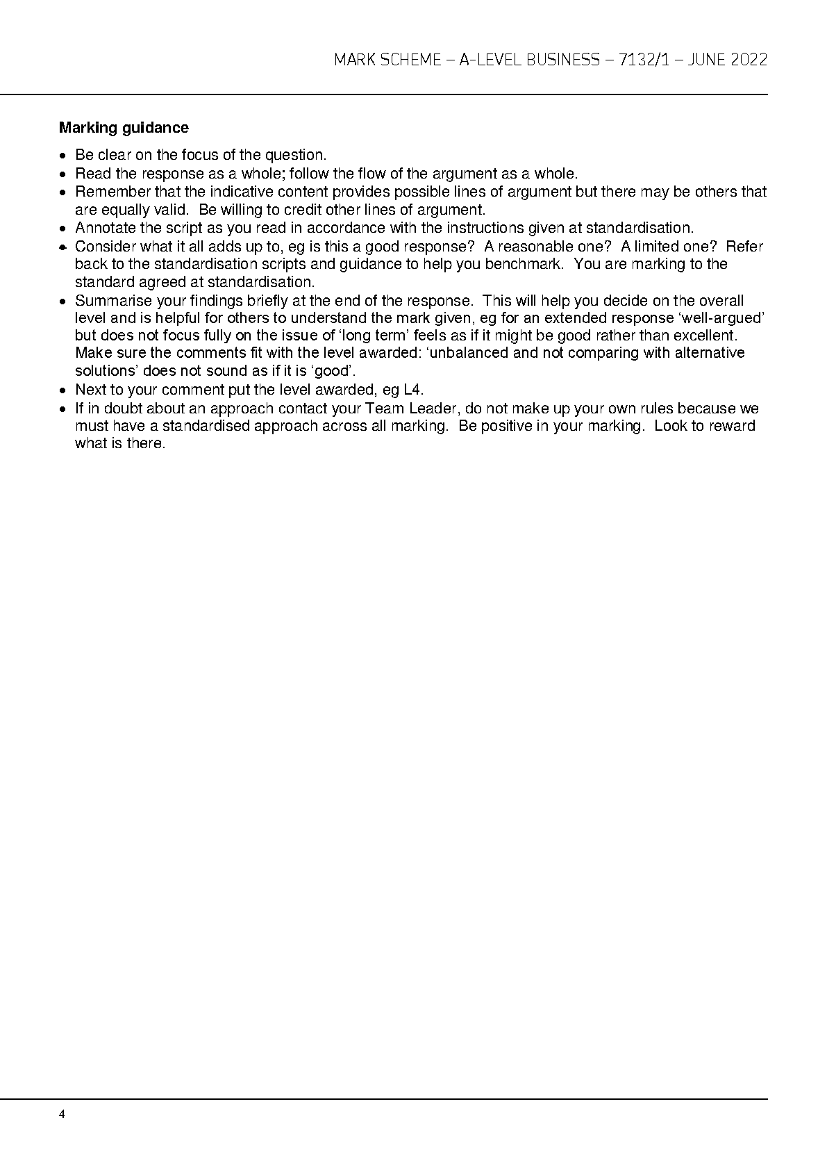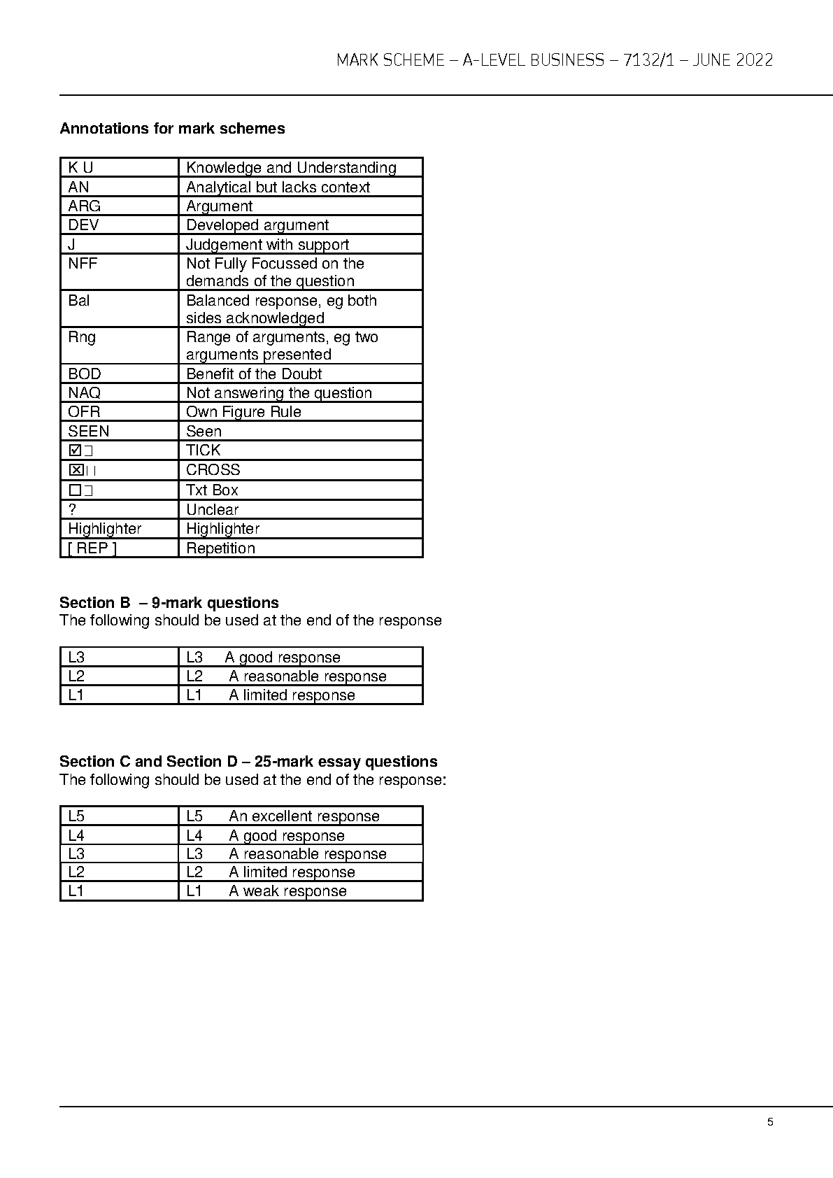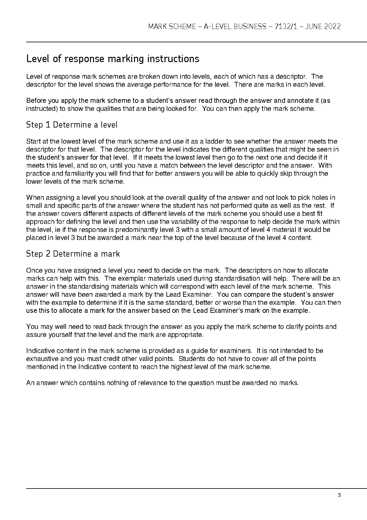AQA A LEVEL BUSINESS PAPER 1 JUNE 2022 MARK SCHEME (7132/1: Paper 1 Business 1)