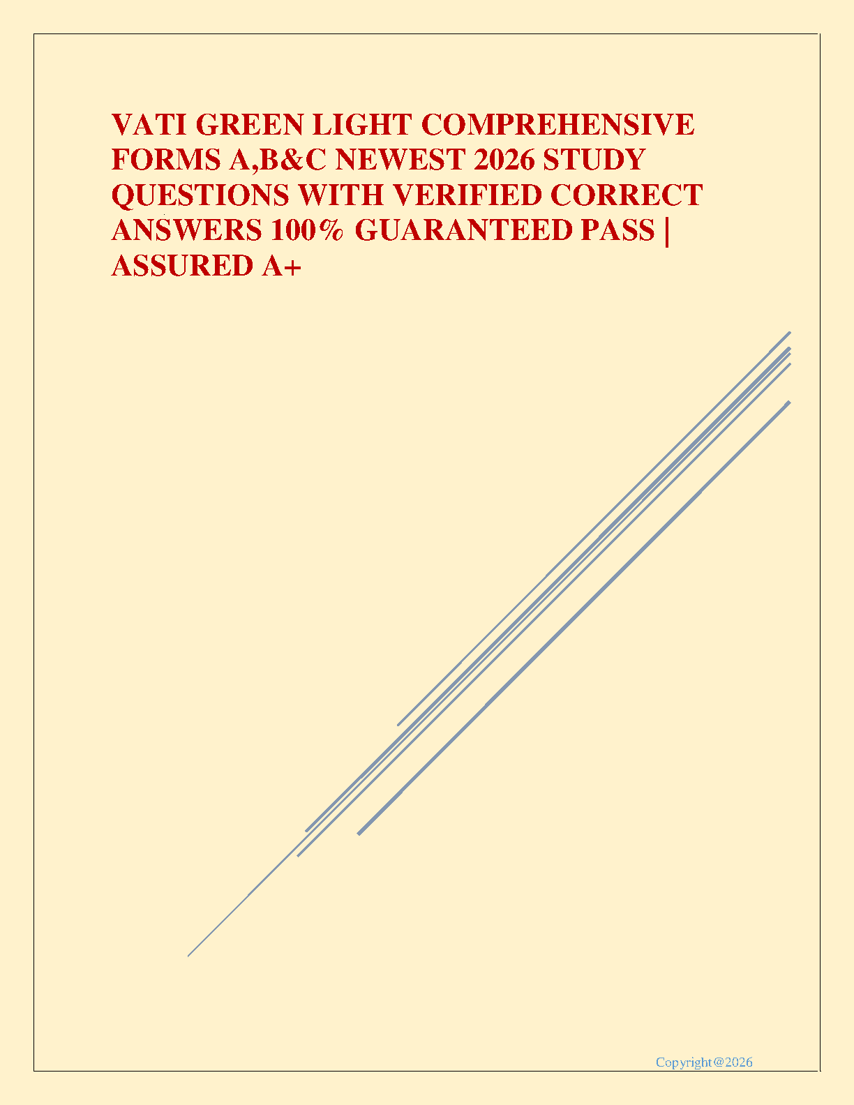 Prepare to excel with our ultimate study guide for the VATI Green Light Comprehensive Exam, covering Forms A, B, and C. This resource is fully updated for the 2025/2026 academic year and provides a complete set of study questions with expertly verified correct answers. Our guide is meticulously designed to ensure you understand all the core concepts, helping you achieve a guaranteed pass and an A+ grade. Stop worrying about resits and get the green light to success on your first attempt with this essential preparation tool.