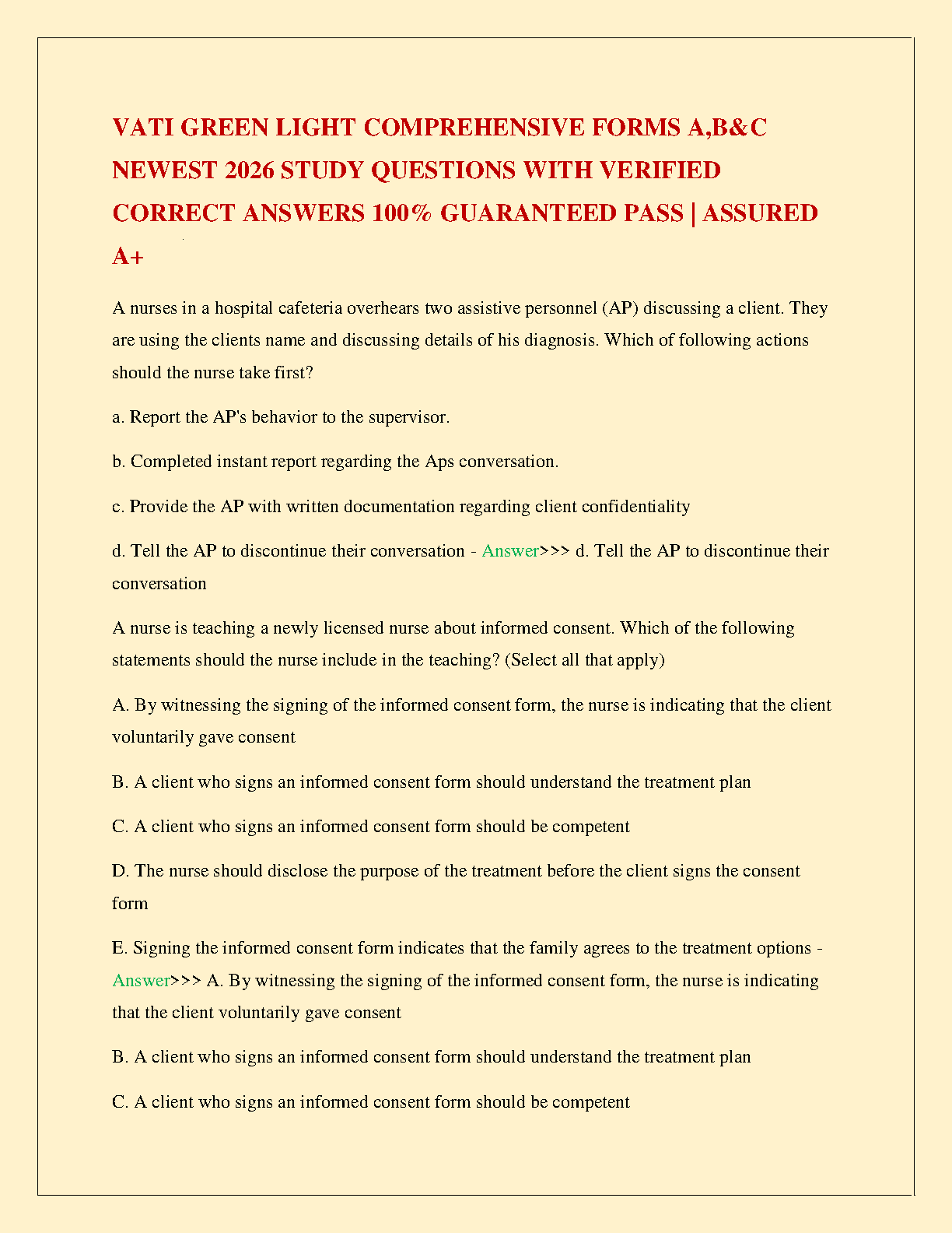 VATI Green Light Comprehensive Forms A, B & C 2026: Complete Study Guide with Verified Questions and Answers for a Guaranteed Pass