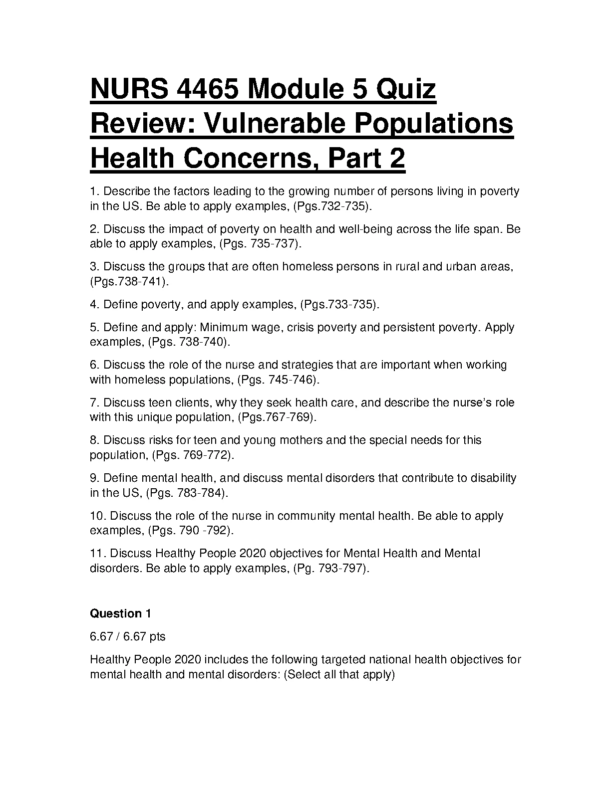 NURS 4465 Module 5 Quiz Review: Vulnerable Populations Health Concerns, Part 2