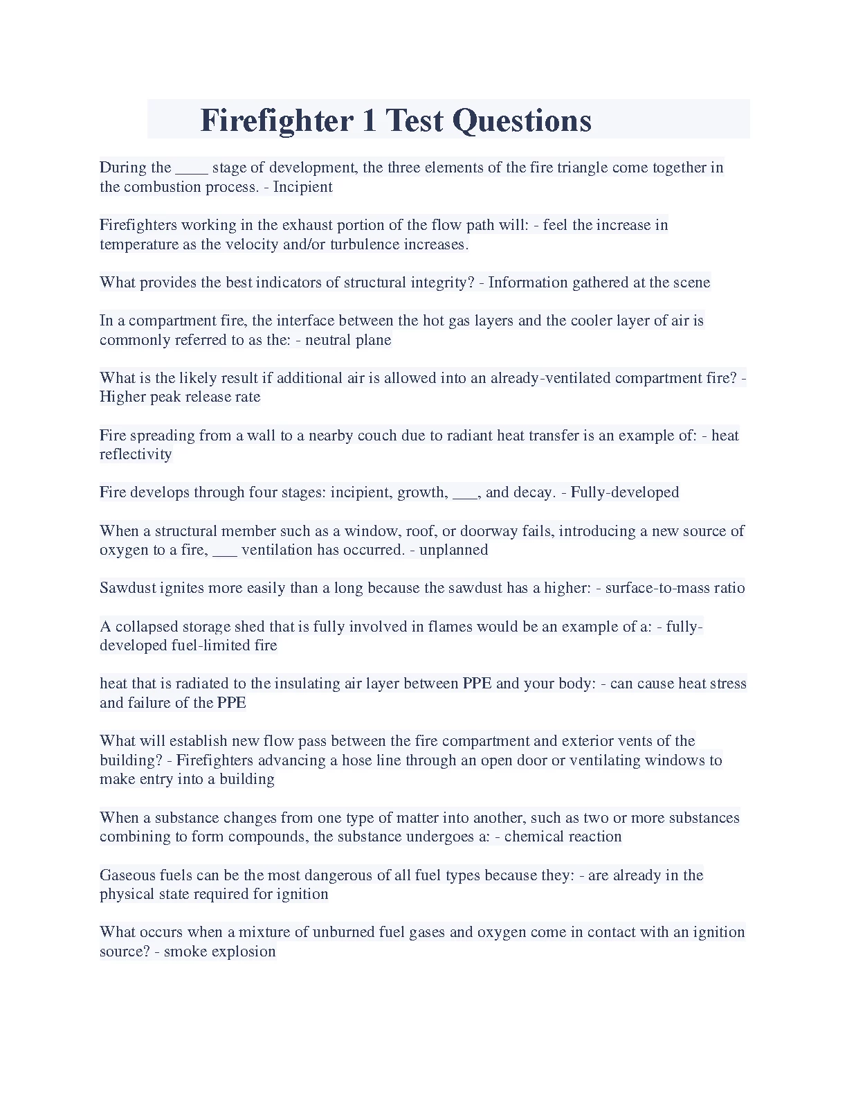 Firefighter 1 Test Questions & Answers. RATED A+
