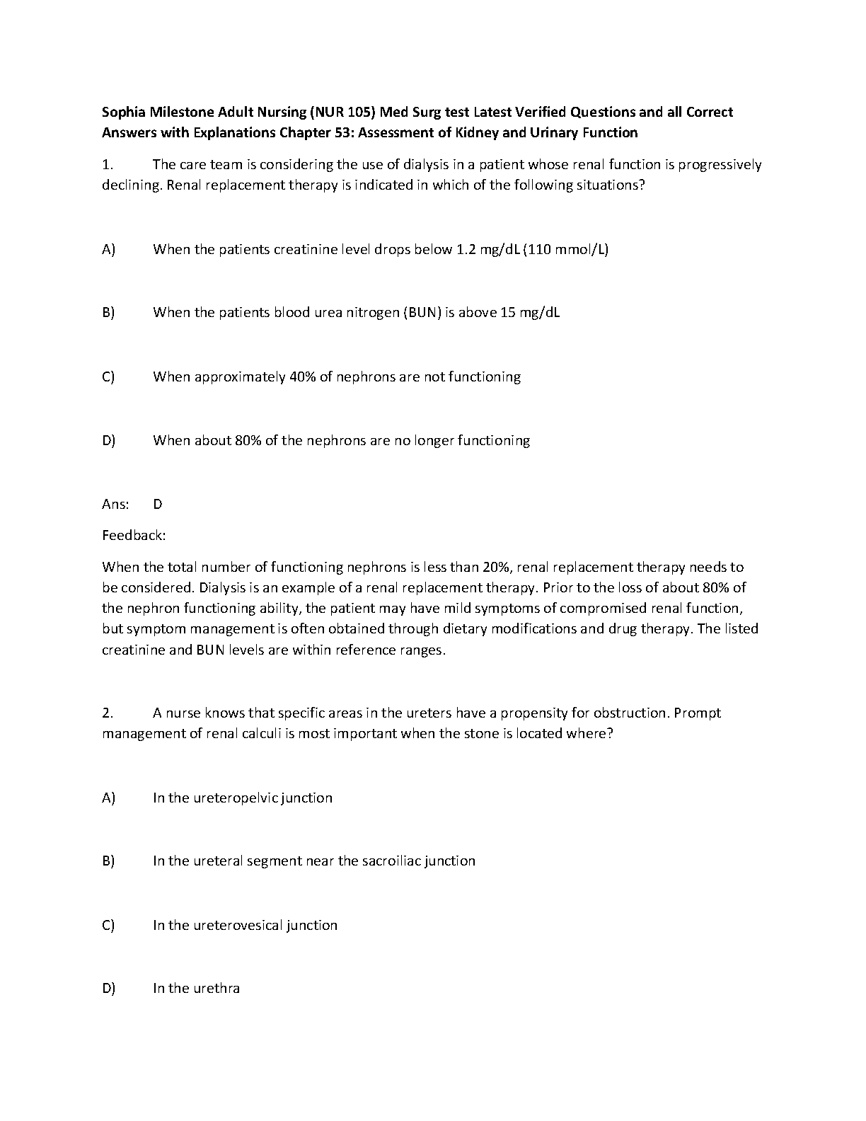 Sophia Milestone Adult Nursing (NUR 105) Med Surg test Latest Verified Questions and all Correct Answers with Explanations Chapter 53: Assessment of Kidney and Urinary Function. DOWNLOAD INSTANTLY on www.hackedexams.com INSTANTLY
