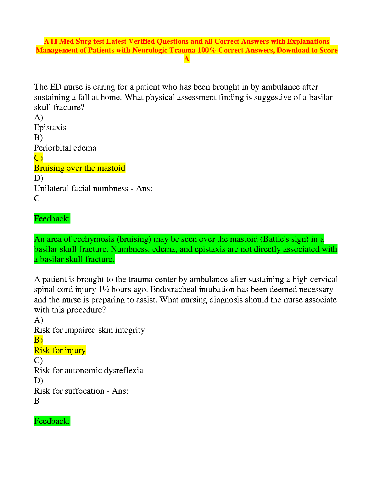 ATI Med Surg test Latest Verified Questions and all Correct Answers with Explanations Management of Patients with Neurologic Trauma 100% Correct Answers, BRAND NEW SOLUTION . DOWNLOAD INSTANTLY on www.hackedexams.com INSTANTLY