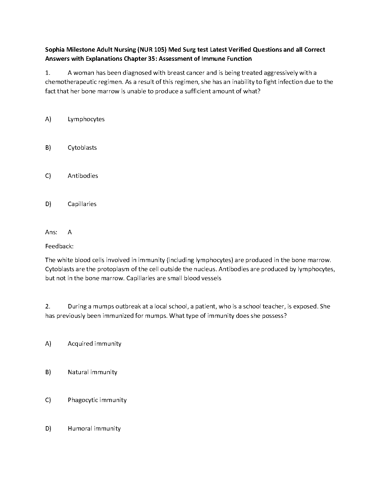 Sophia Milestone Adult Nursing (NUR 105) Med Surg test Latest Verified Questions and all Correct Answers with Explanations Chapter 35: Assessment of Immune Function COMPLETE. DOWNLOAD INSTANTLY on www.hackedexams.com INSTANTLY
