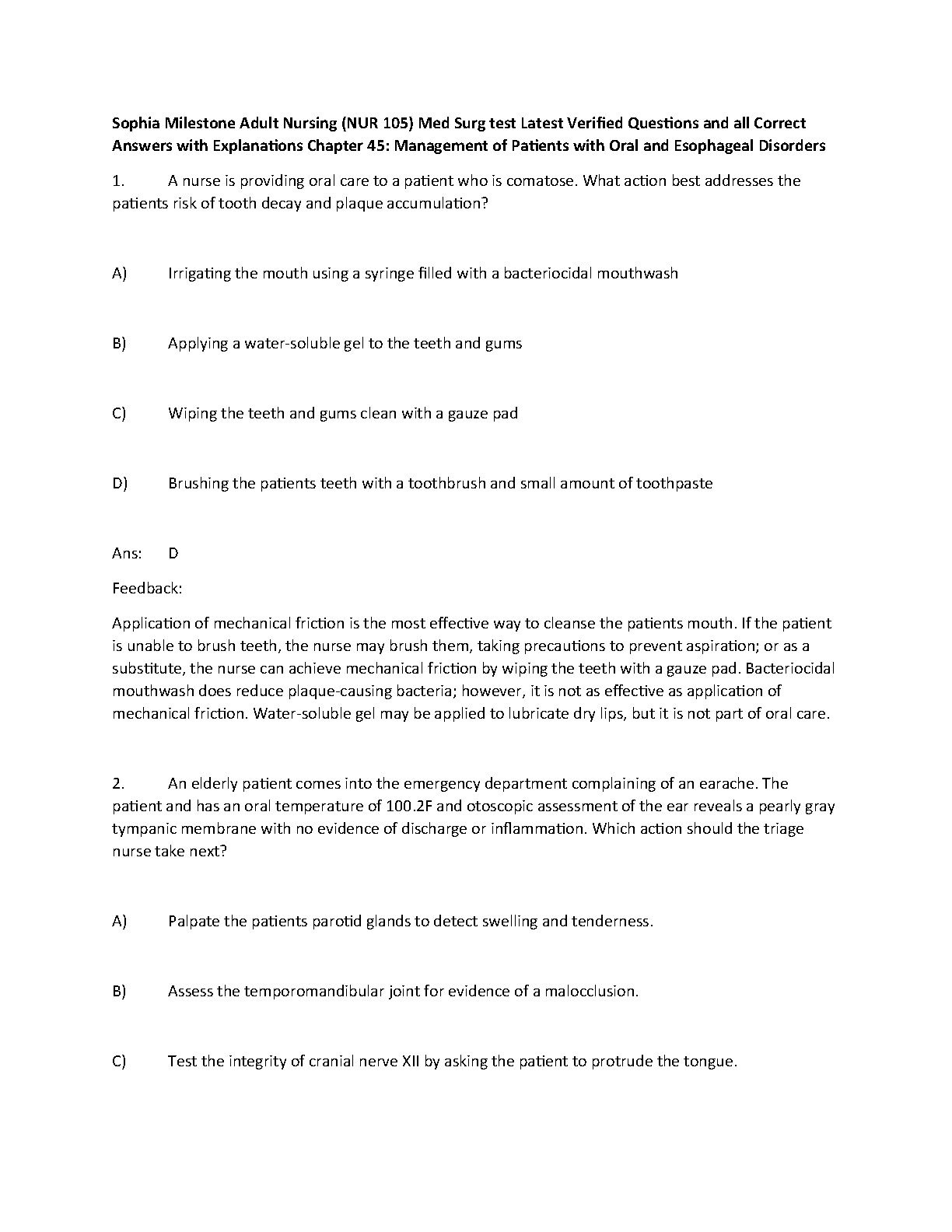 Sophia Milestone Adult Nursing (NUR 105) Med Surg Test. Questions and all Correct Answers with Explanations Chapter 45: Management of Patients with Oral and Esophageal Disorders 2023. DOWNLOAD ON www.Hackedexams.com Instantly.