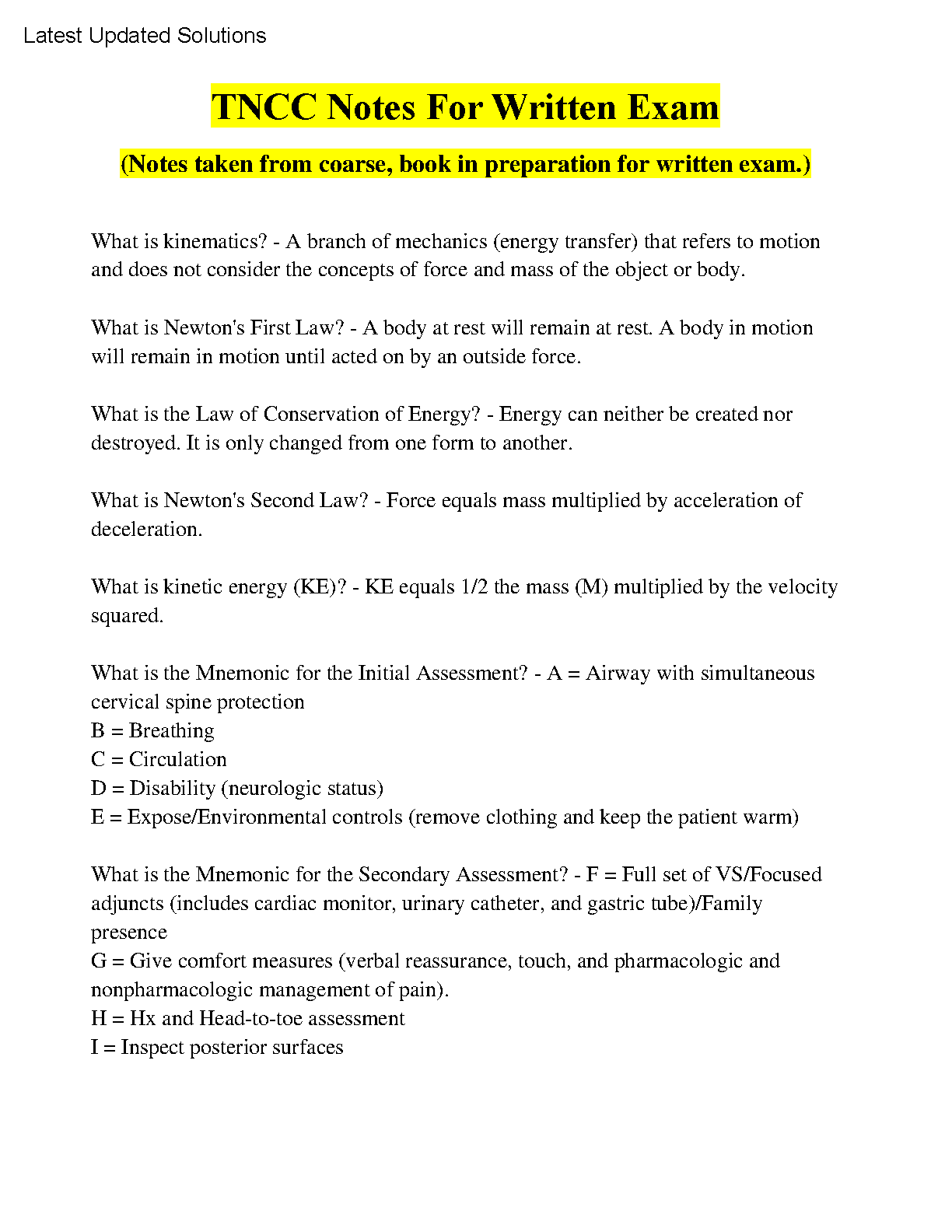 Struggling with the TNCC written exam? Our newly updated 2025/2026 study guide is your key to success! This comprehensive resource provides meticulously compiled notes based on the official ENA Trauma Nursing Core Course Provider Manual, 9th Edition. Inside, you'll find clear, concise explanations of critical concepts such as kinematics, Newton's Laws, and energy conservation, plus essential mnemonics for the Initial (ABCDE) and Secondary (FGHI) Assessments. Stop worrying about resits—these notes are structured to help you master the material and pass your TNCC certification exam confidently on your very first try.