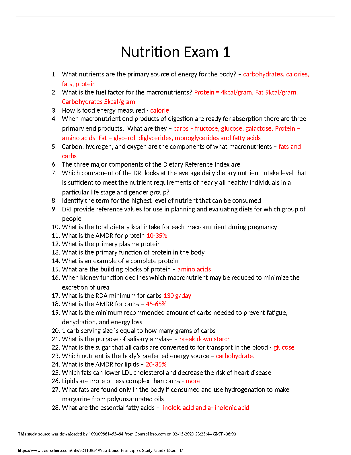 Ace your Nutrition 101 course with this essential Exam 1 Study Guide, fully updated for the 2025/2026 academic year. This resource provides a detailed list of crucial questions and their direct, accurate answers, covering all foundational topics. Master key areas including macronutrients (carbohydrates, proteins, and fats), calorie calculations, the end products of digestion, Dietary Reference Indexes (DRI), AMDR and RDA values, and essential fatty acids. Designed to streamline your revision process, this study guide helps you focus on what's important, ensuring you understand the core principles to pass your exam with confidence and avoid resits. Download now to start studying smarter!
