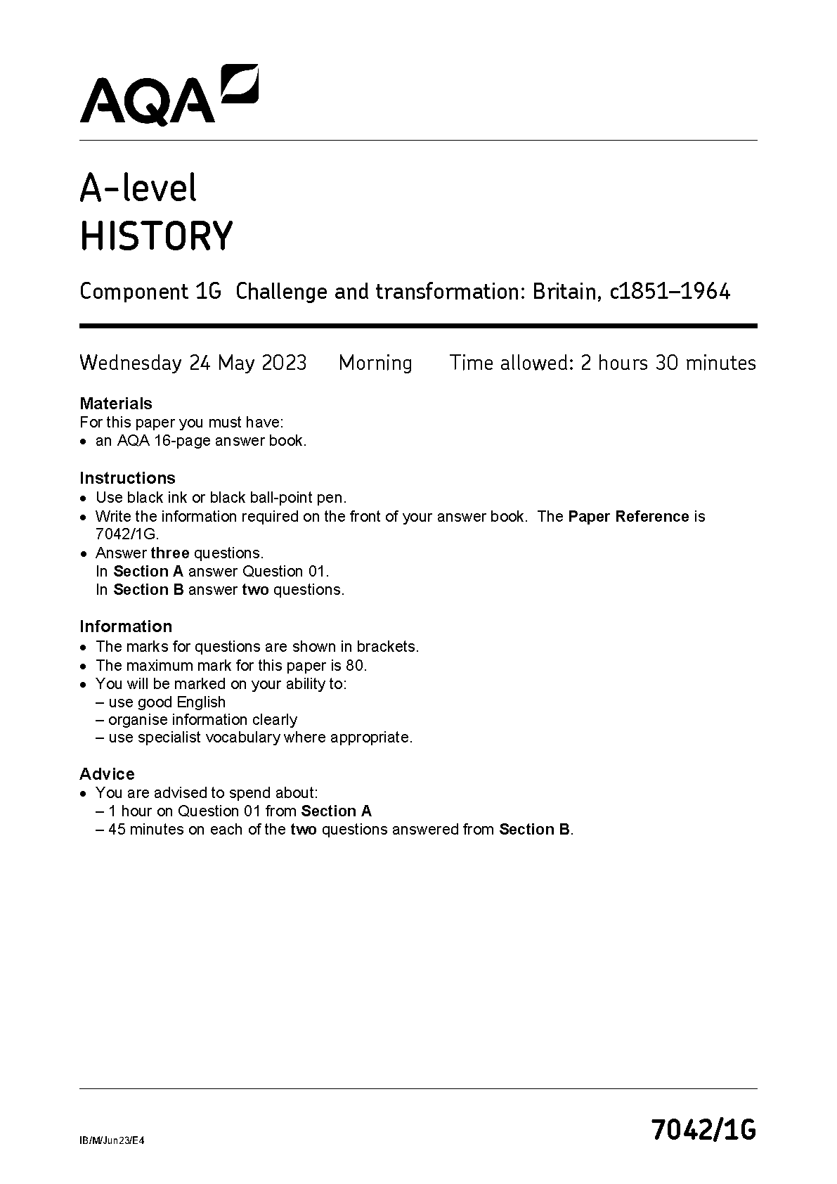 AQA A LEVEL HISTORY PAPER 1 2023 QUESTION PAPER AND MARK SCHEME BUNDLE (7042/1G: Challenge and transformation: Britain, c1851–1964). OFFICIAL AQA A LEVEL HISTORY PAPER 1 2023 BUNDLE. DOWNLOAD ON www.hackedexams.com INSTANTLY.