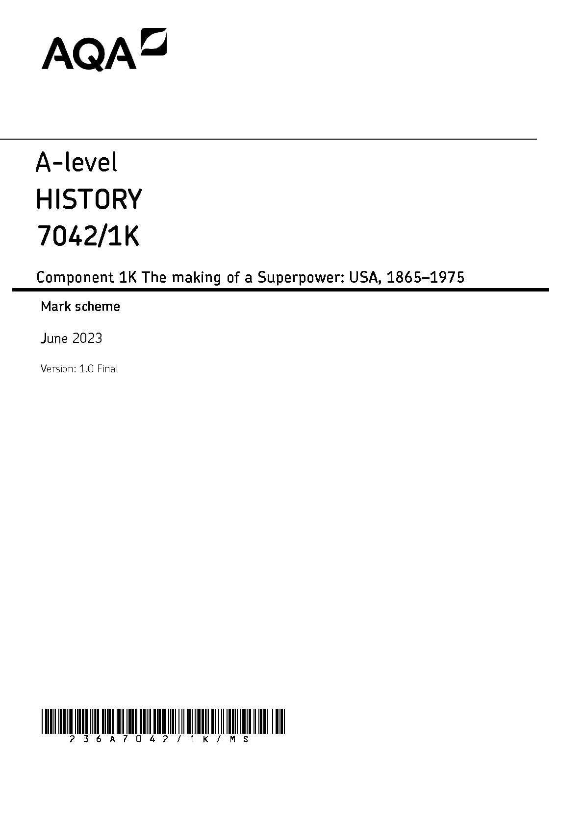 AQA A LEVEL HISTORY PAPER 1 2023 QUESTION PAPER AND MARK SCHEME BUNDLE (7042/1K: The making of a Superpower: USA, 1865–1975)