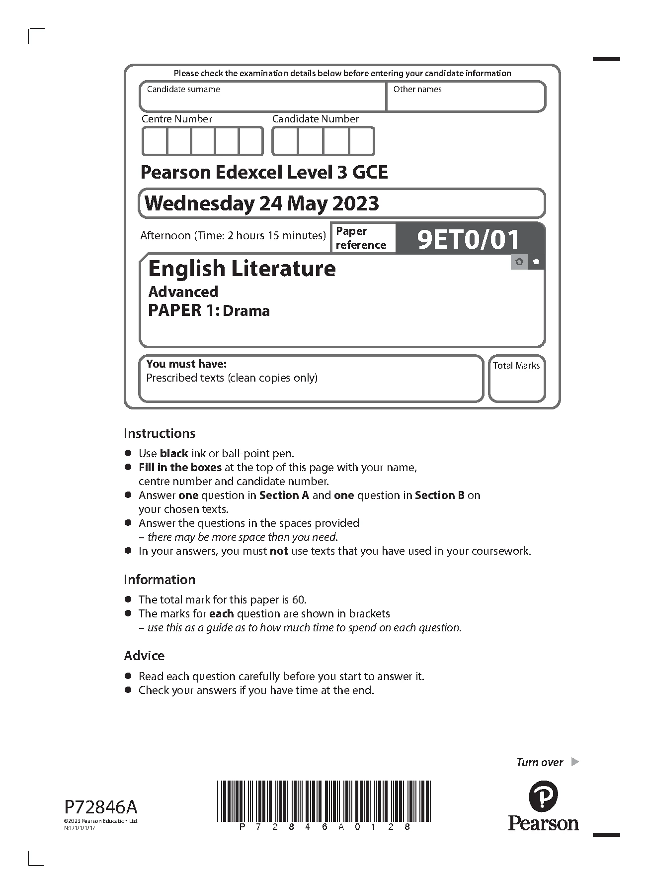 PEARSON EDEXCEL A LEVEL ENGLISH LITERATURE PAPER 1 2023 (9ET0/01: Drama)