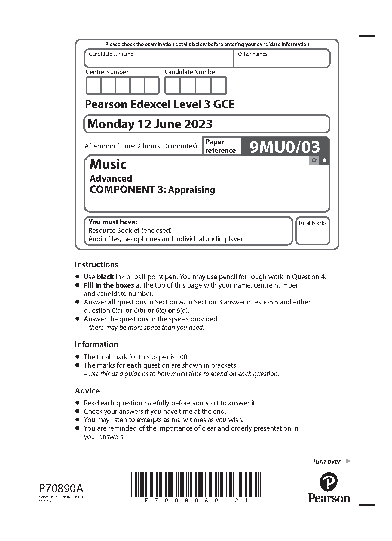 PEARSON EDEXCEL A LEVEL MUSIC PAPER 3 2023 (9IN0/03: COMPONENT 3: Appraising)