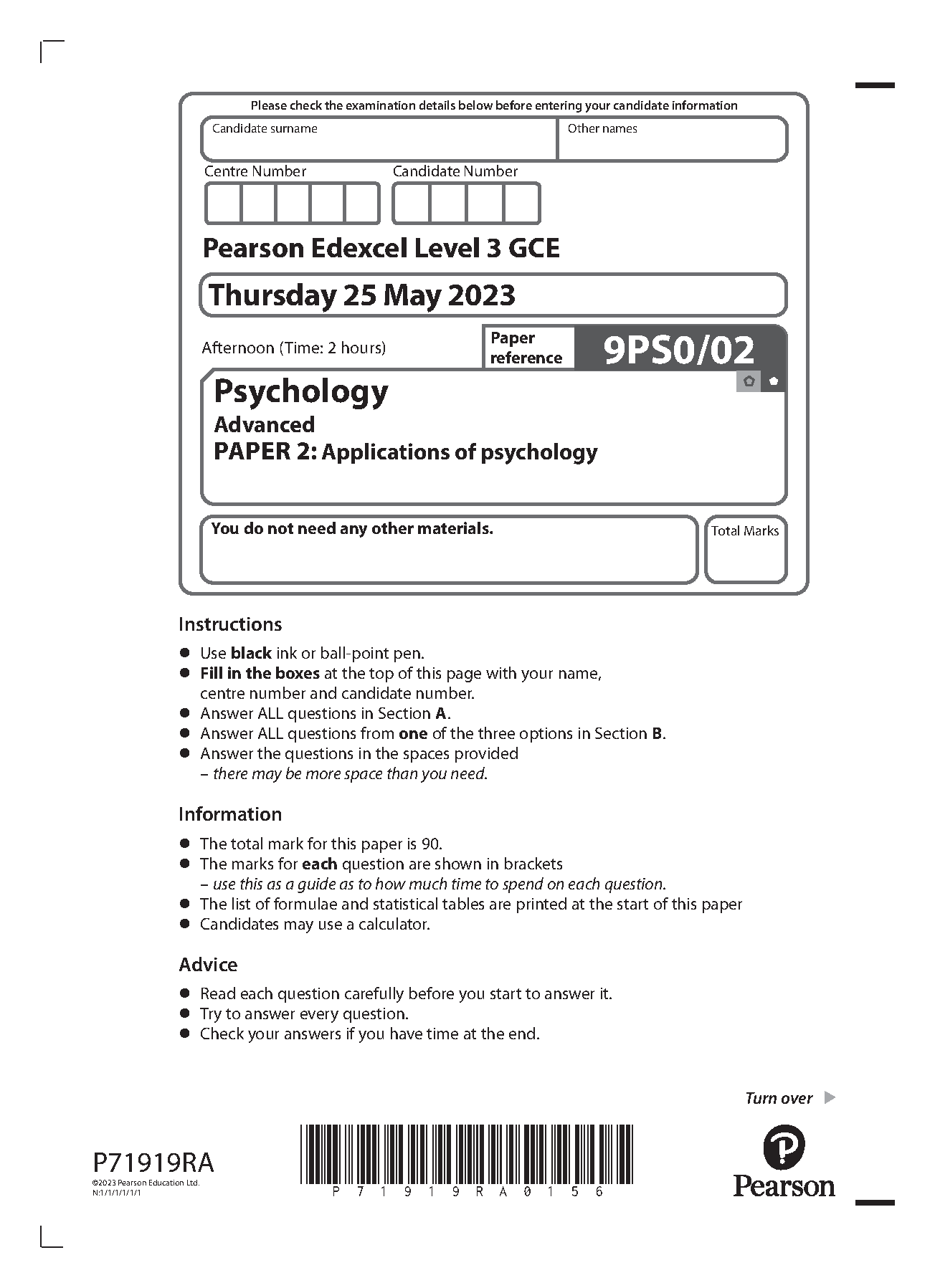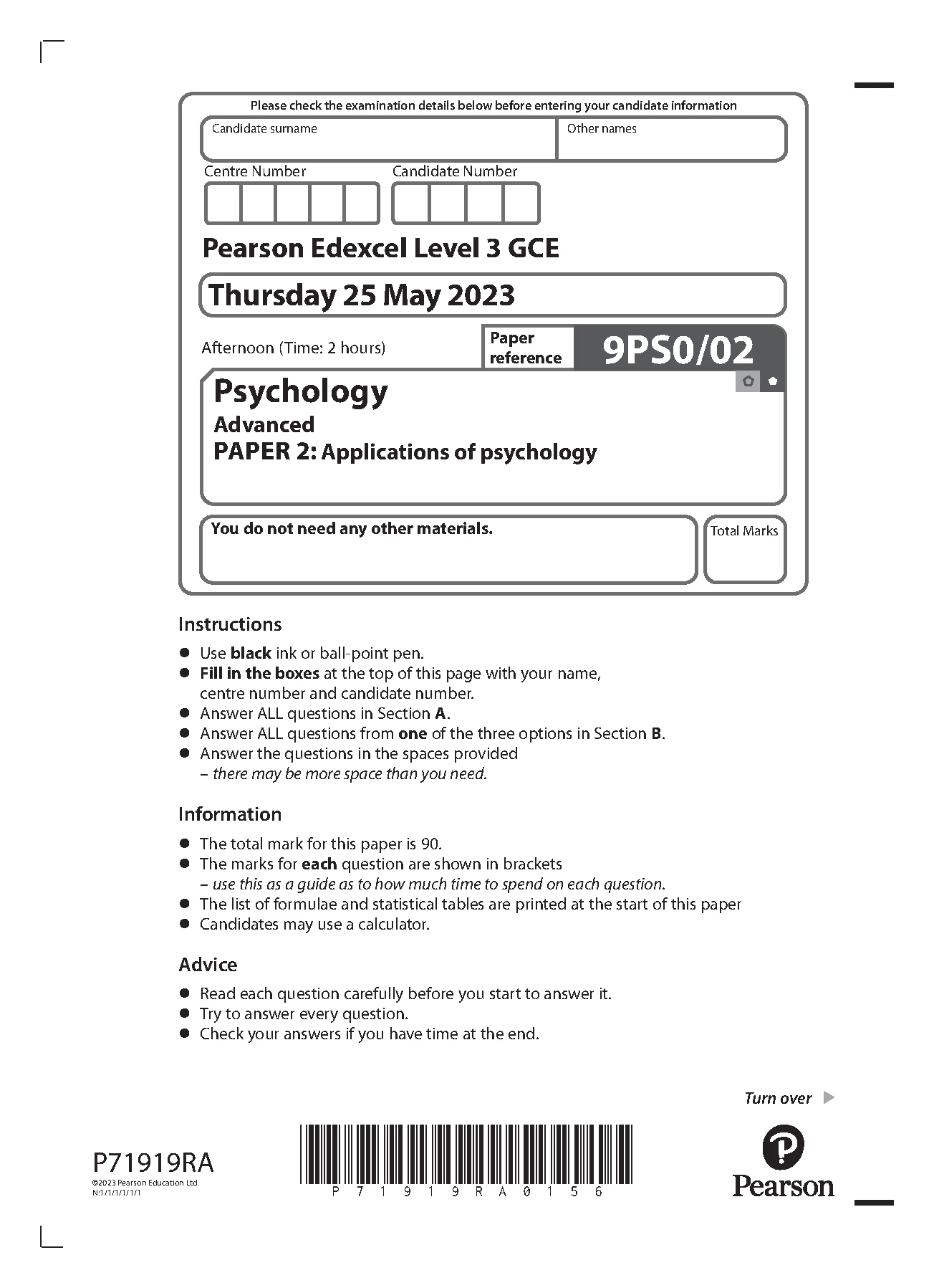 PEARSON EDEXCEL A LEVEL PSYCHOLOGY PAPER 2 2023 (9PS0/02: Applications Of Psychology)