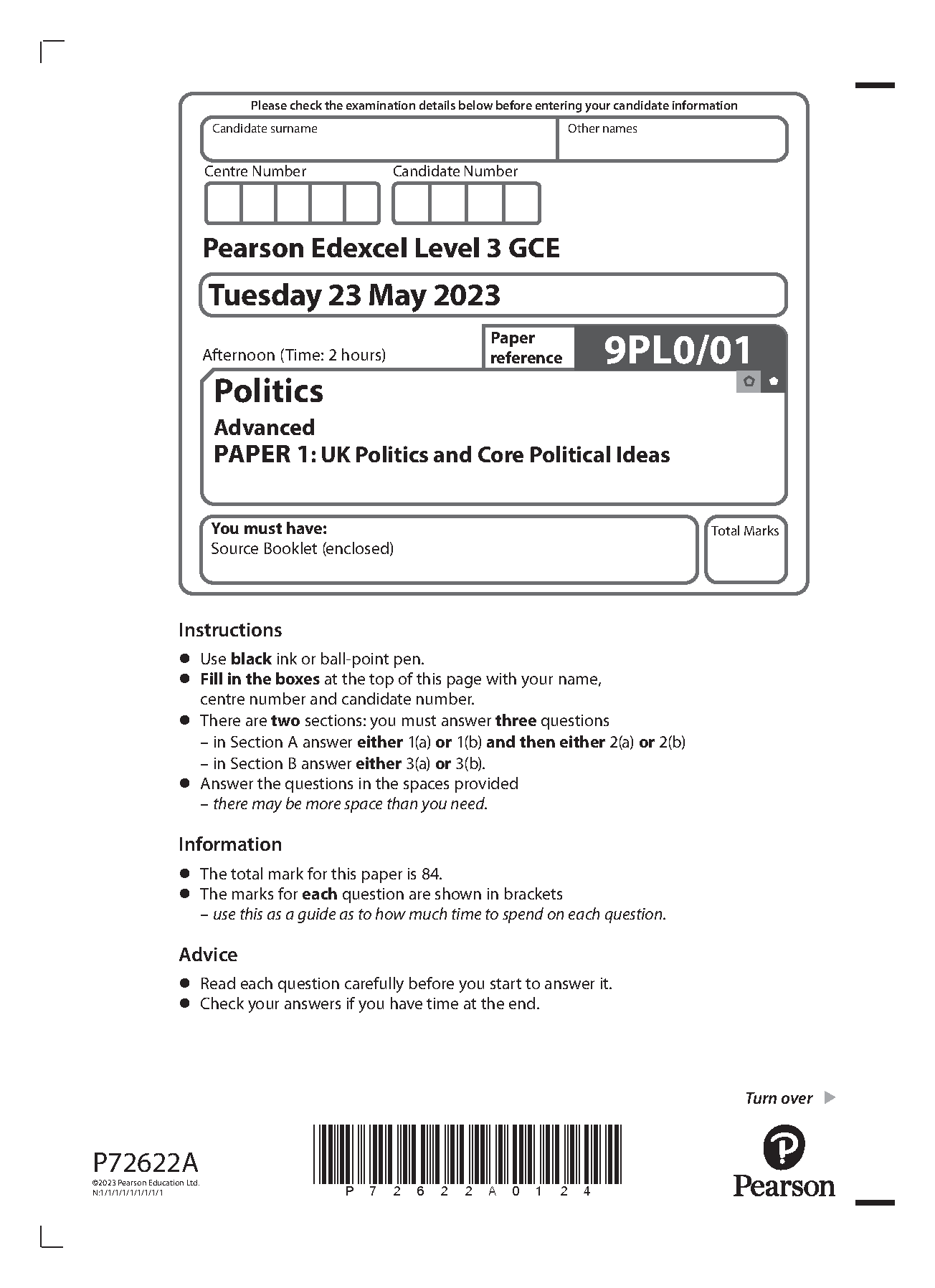 PEARSON EDEXCEL A LEVEL POLITICS PAPER 1 2023 (9PL0/01: UK Politics And Core Political Ideas)