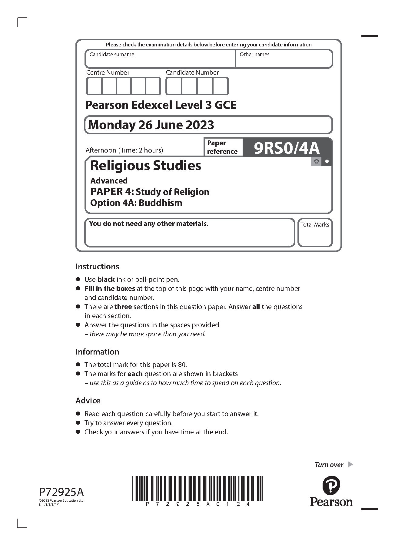 PEARSON EDEXCEL A LEVEL RELIGIOUS STUDIES PAPER 4 2023 (9RS0/4A: Study Of Religion Option 4A: Buddhism)