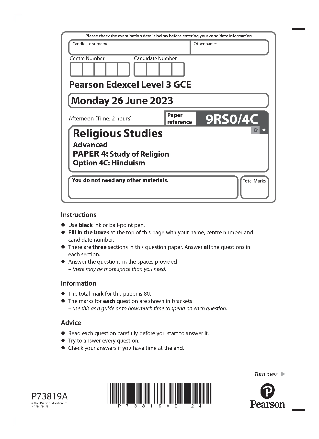 PEARSON EDEXCEL A LEVEL RELIGIOUS STUDIES PAPER 4 2023 (9RS0/4C: Study Of Religion Option 4C: Hinduism)
