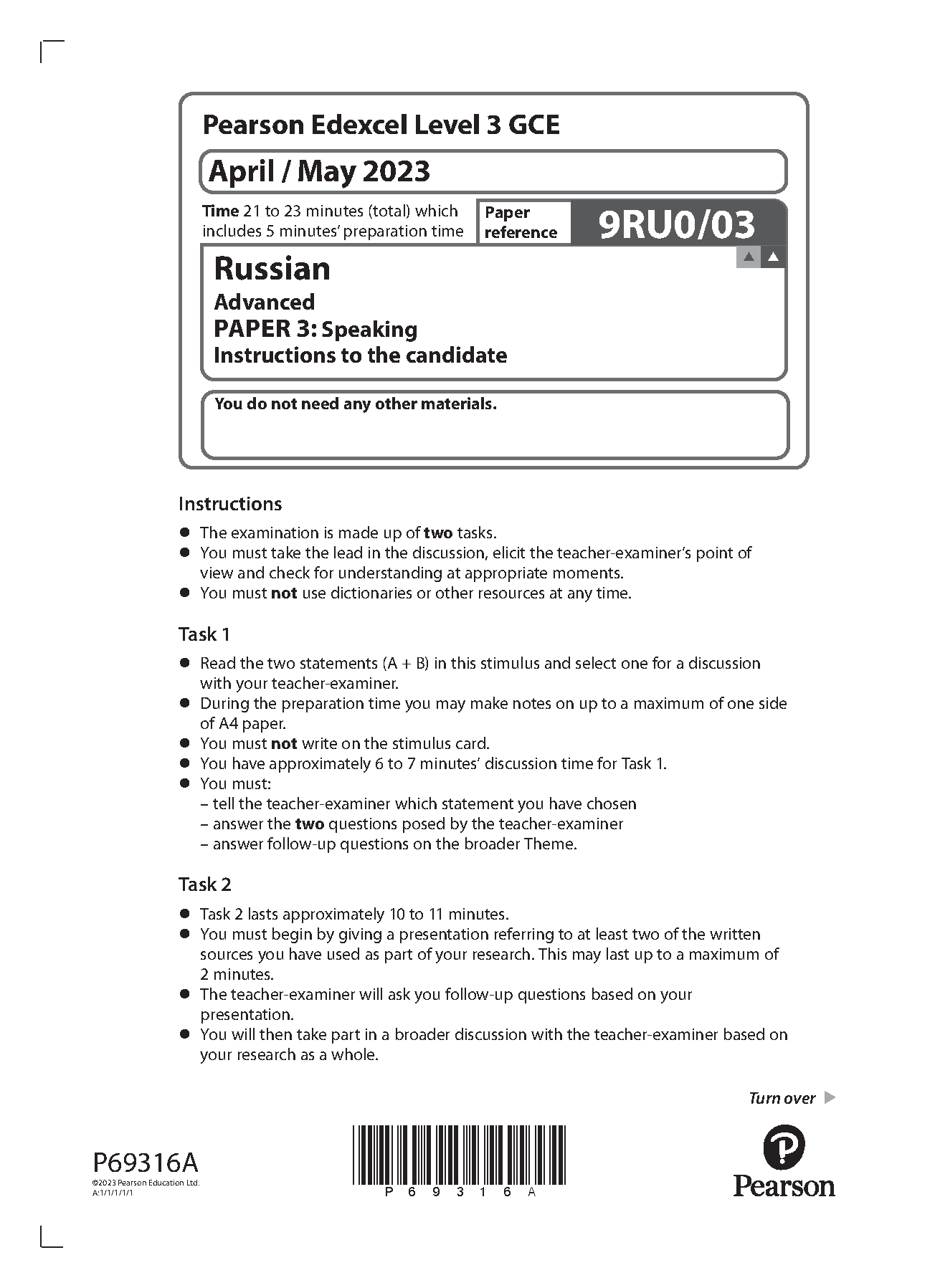 PEARSON EDEXCEL A LEVEL RUSSIAN PAPER 3 2023 (9RU0/03: Speaking Instructions to the candidate)