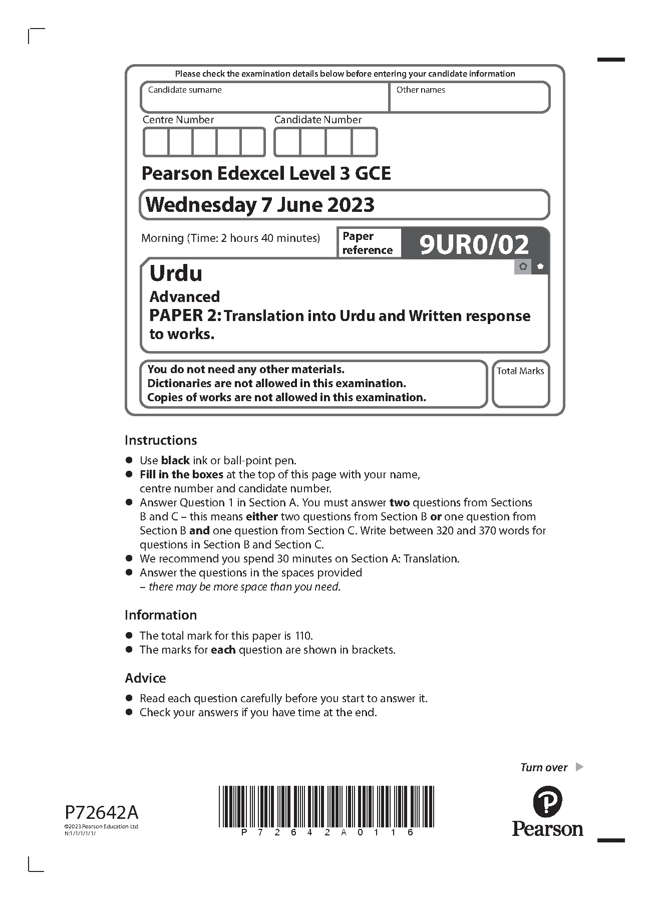 PEARSON EDEXCEL A LEVEL URDU PAPER 2 2023 (9UR0/02 : Translation Into Urdu And Written Response To Works.)