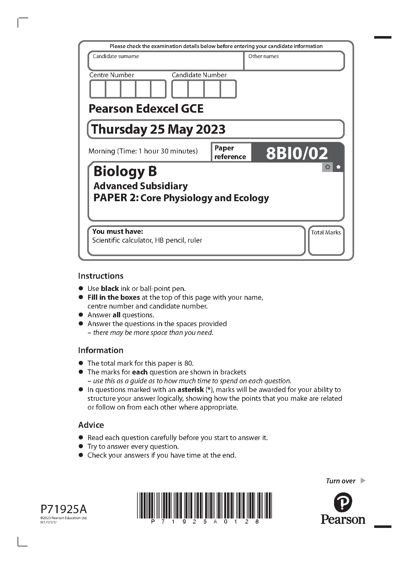 PEARSON EDEXCEL AS BIOLOGY B PAPER 2 2023 (8BI0/02: Core Physiology And Ecology)