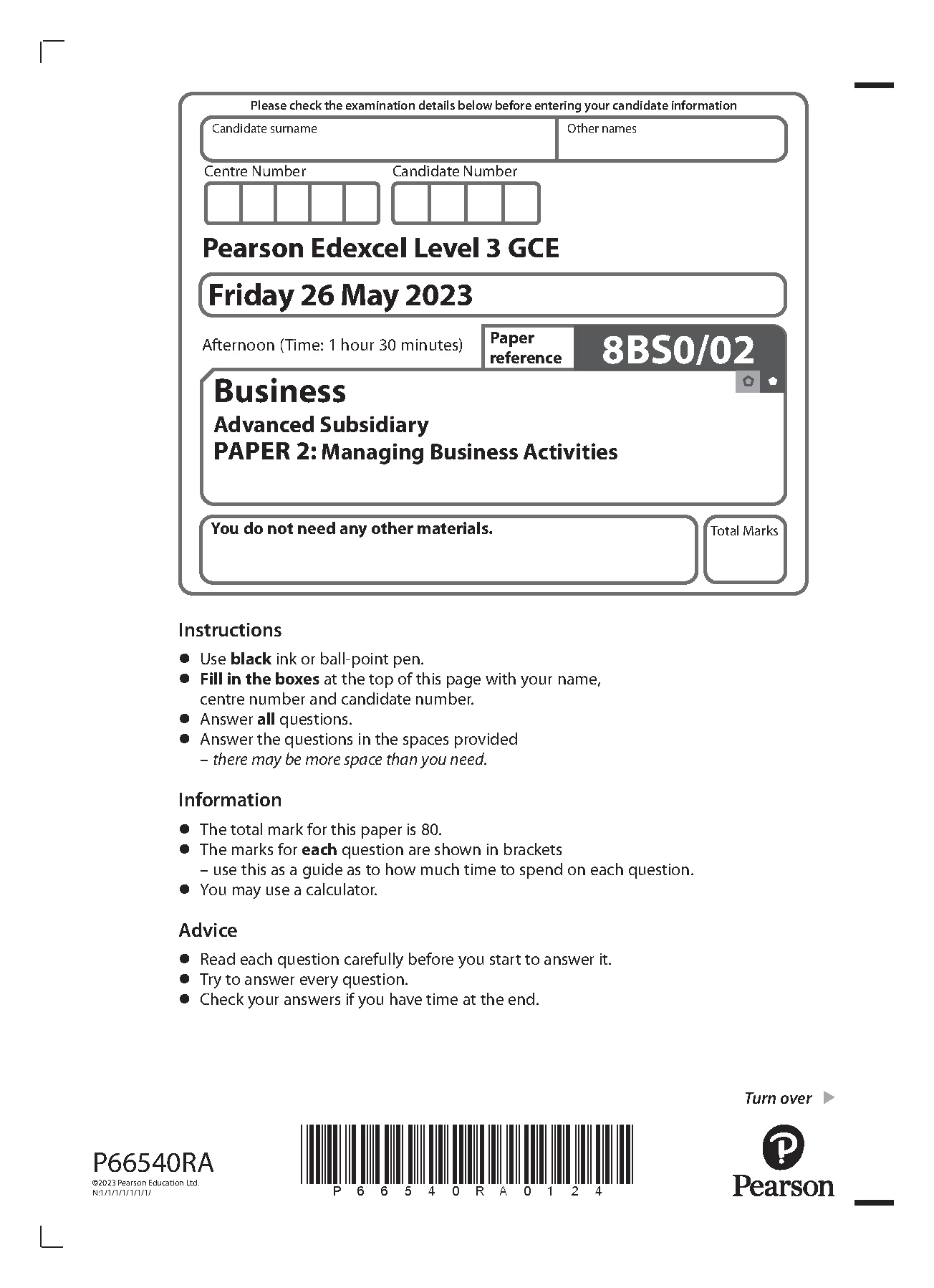 PEARSON EDEXCEL AS BUSINESS PAPER 2 2023 (8BS0/02: Managing Business Activities)