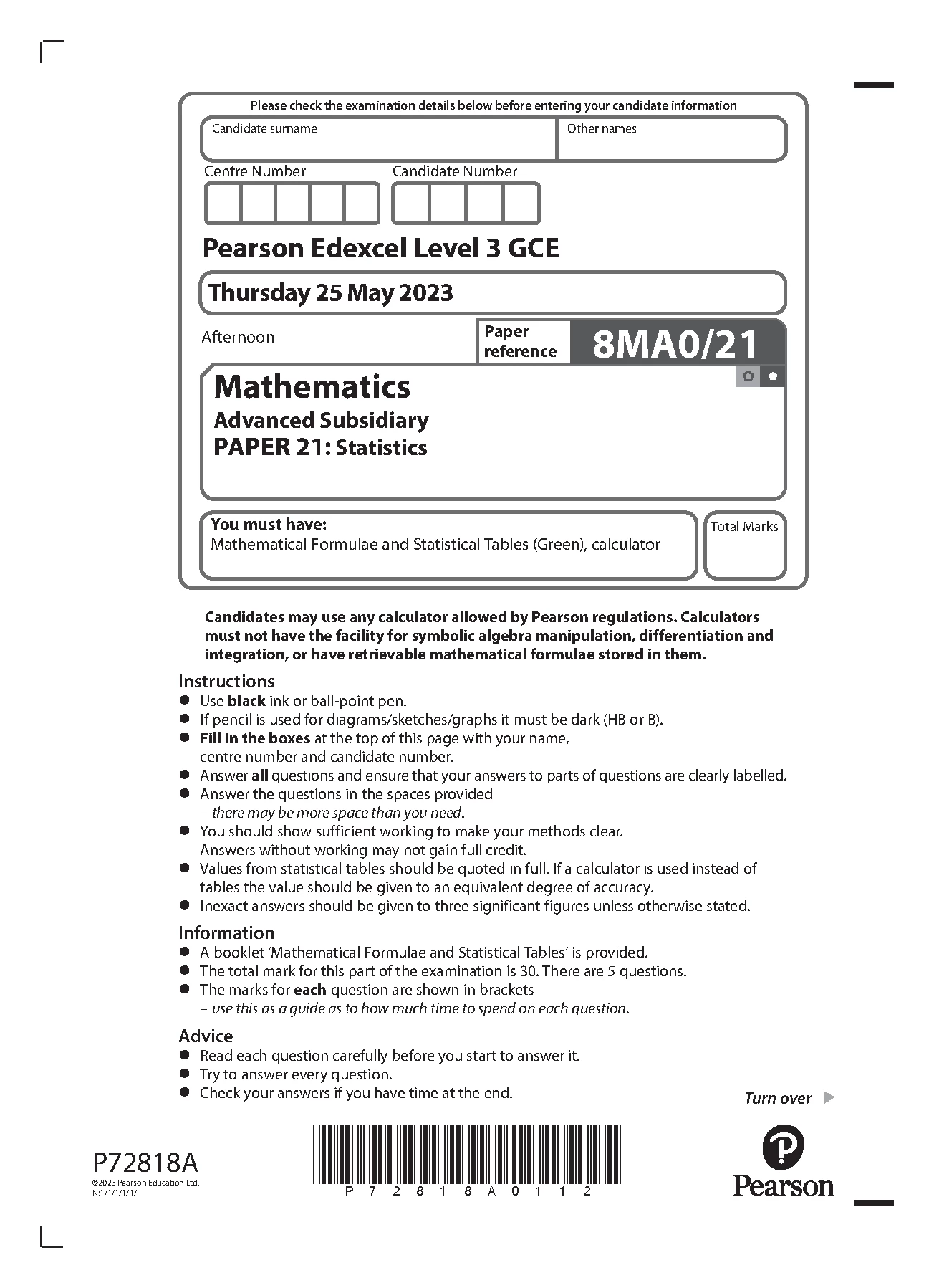 PEARSON EDEXCEL AS MATHEMATICS PAPER 21 2023 (8MA0/21: Statistics)