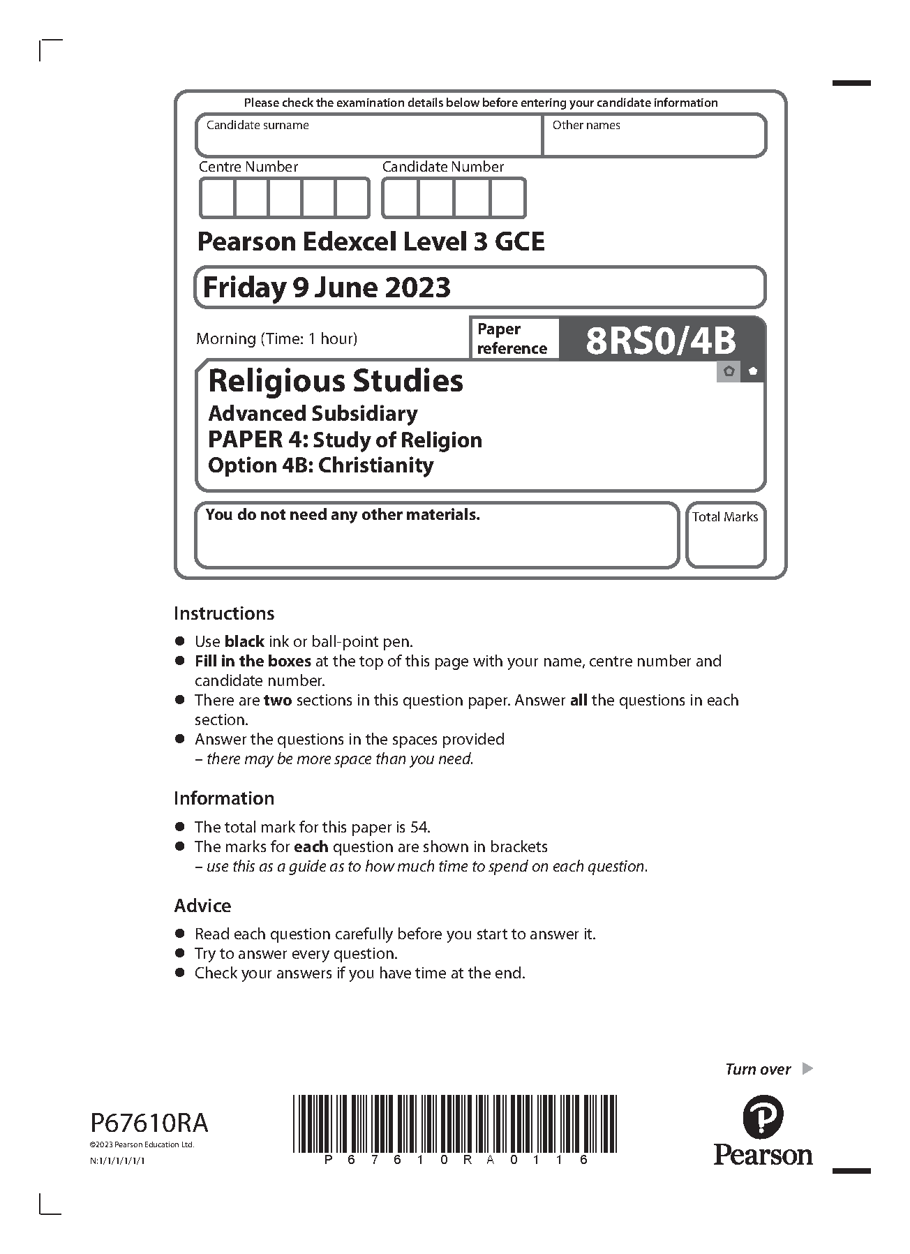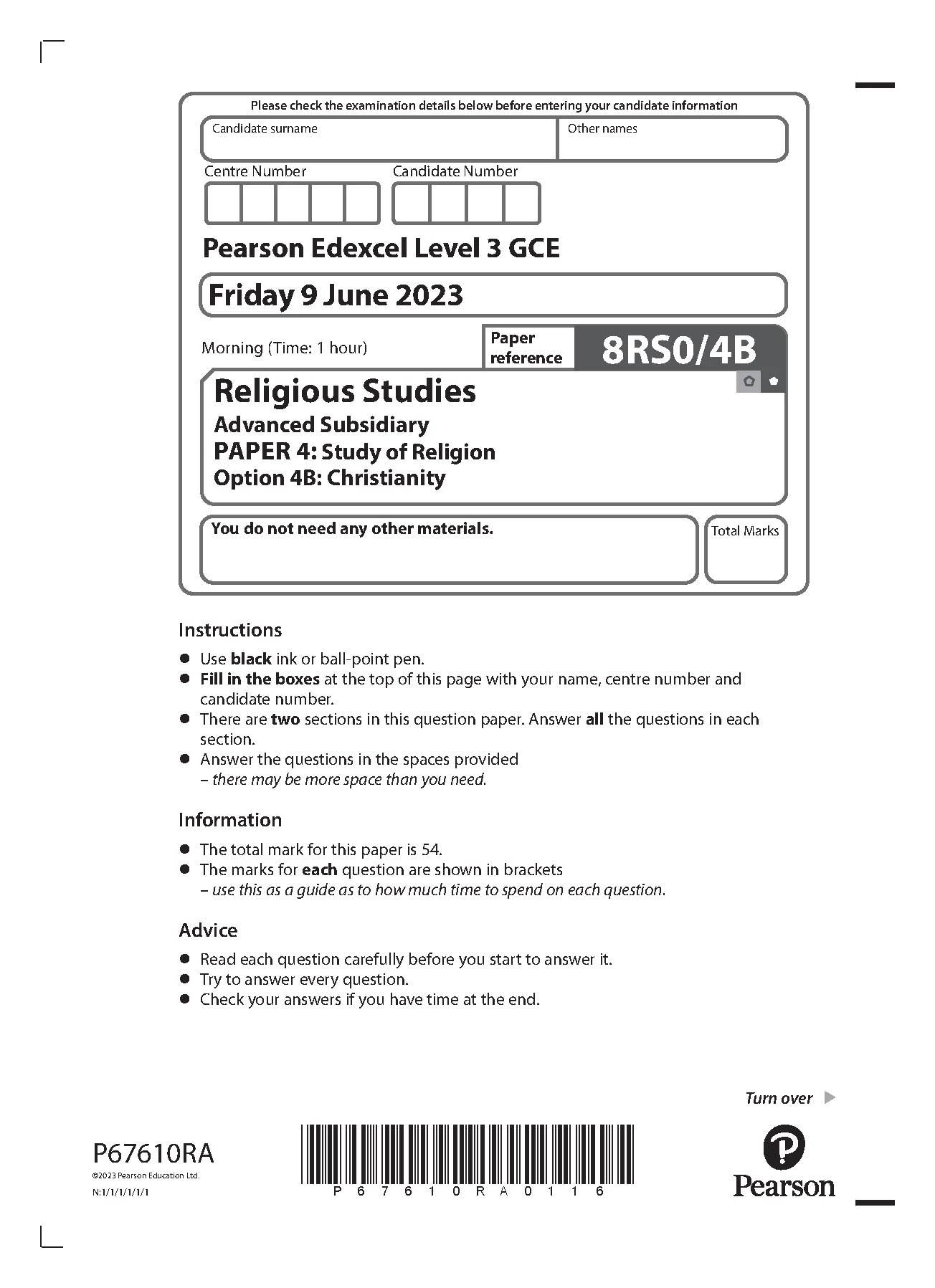 PEARSON EDEXCEL AS RELIGIOUS STUDIES PAPER 4 2023 (8RS0/4B: Study Of Religion Option 4B: Christianity)