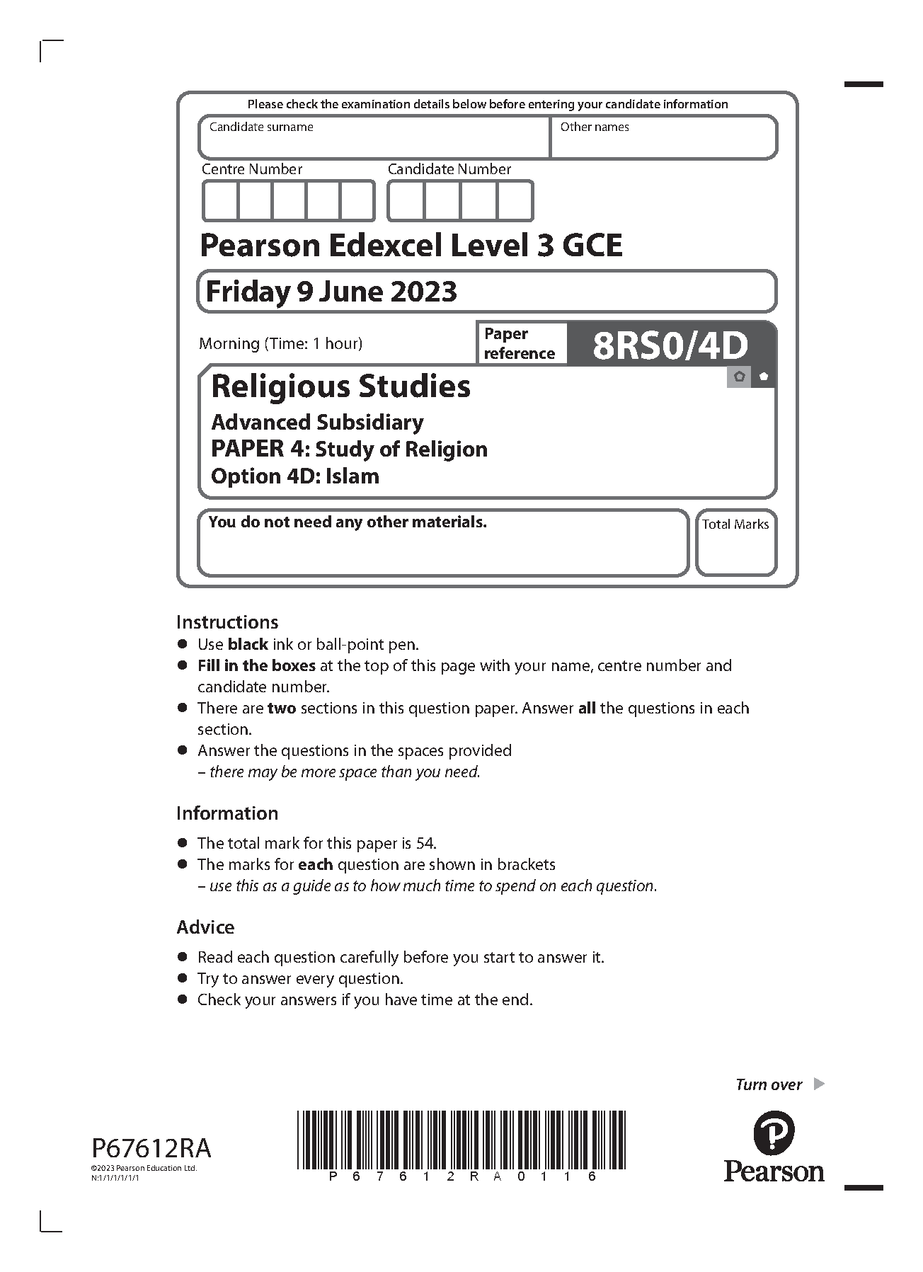 PEARSON EDEXCEL AS RELIGIOUS STUDIES PAPER 4 2023 (8RS0/4D: Study Of Religion Option 4D: Islam)