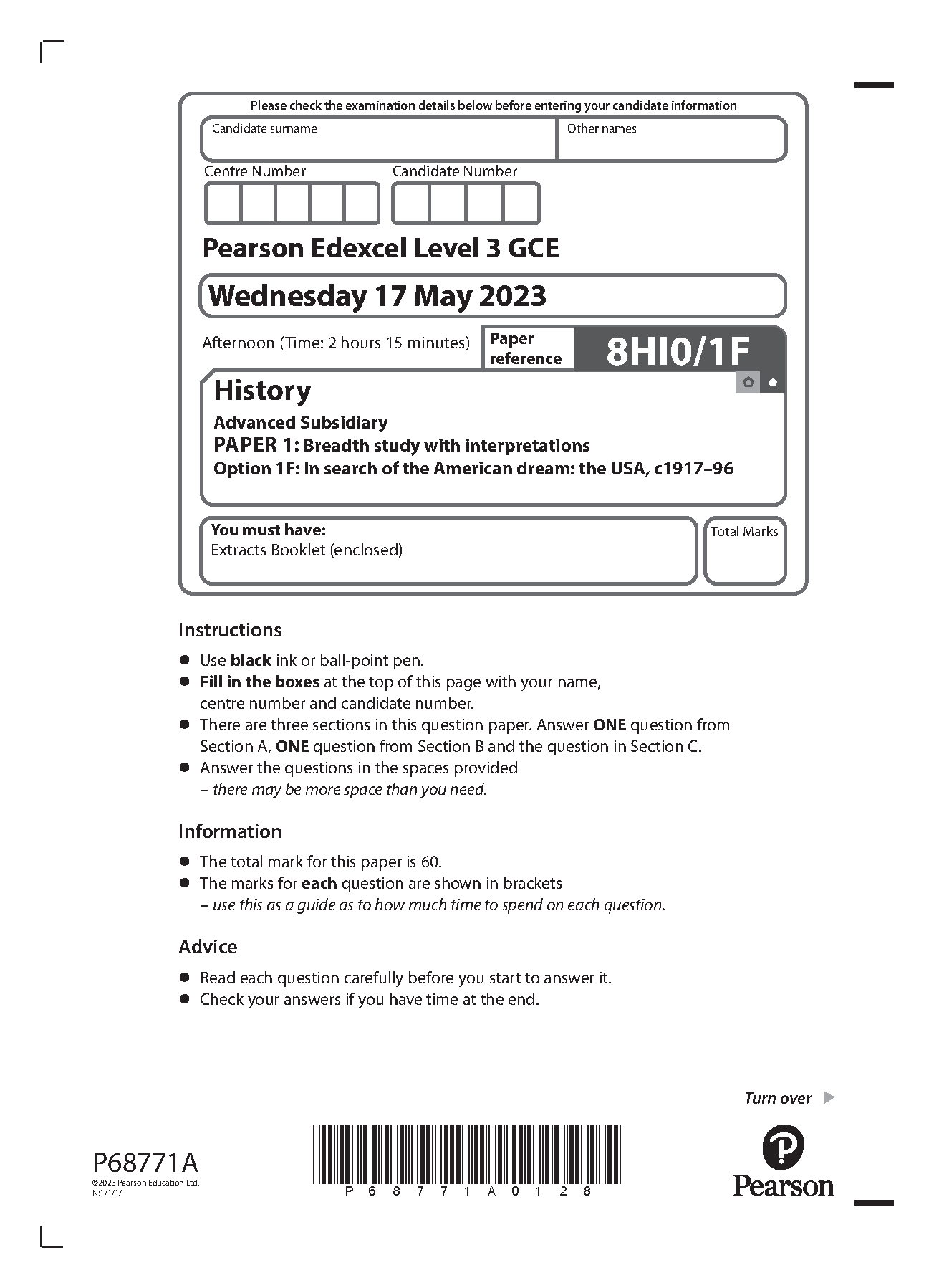 PEARSON EDEXCEL AS HISTORY PAPER 1 2023 (8HI0/1F: Breadth Study With Interpretations Option 1F: In Search Of The American Dream: The USA, C1917–96 )